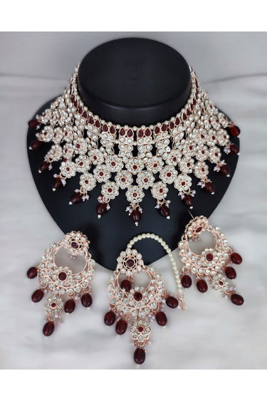 Alloy Material Bewitching Necklace Set With Earrings And Mang Tikka For Girls And Women In Red Stone