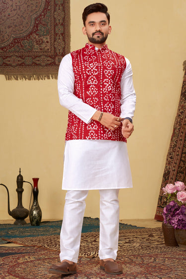 Festive Fashion Cotton Fabric Red Color Readymade Kurta Pyjama With Bandhani Print Jacket
