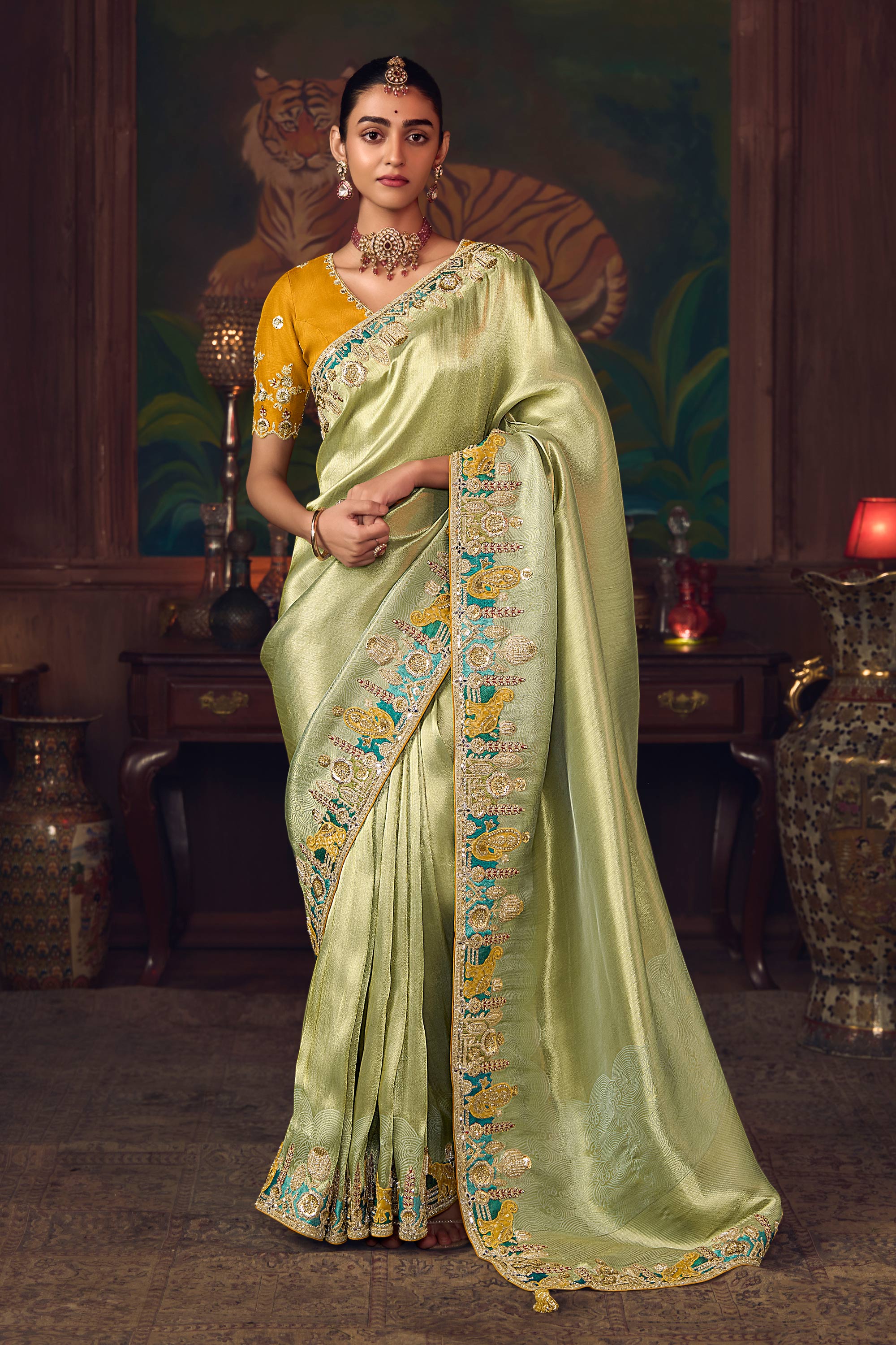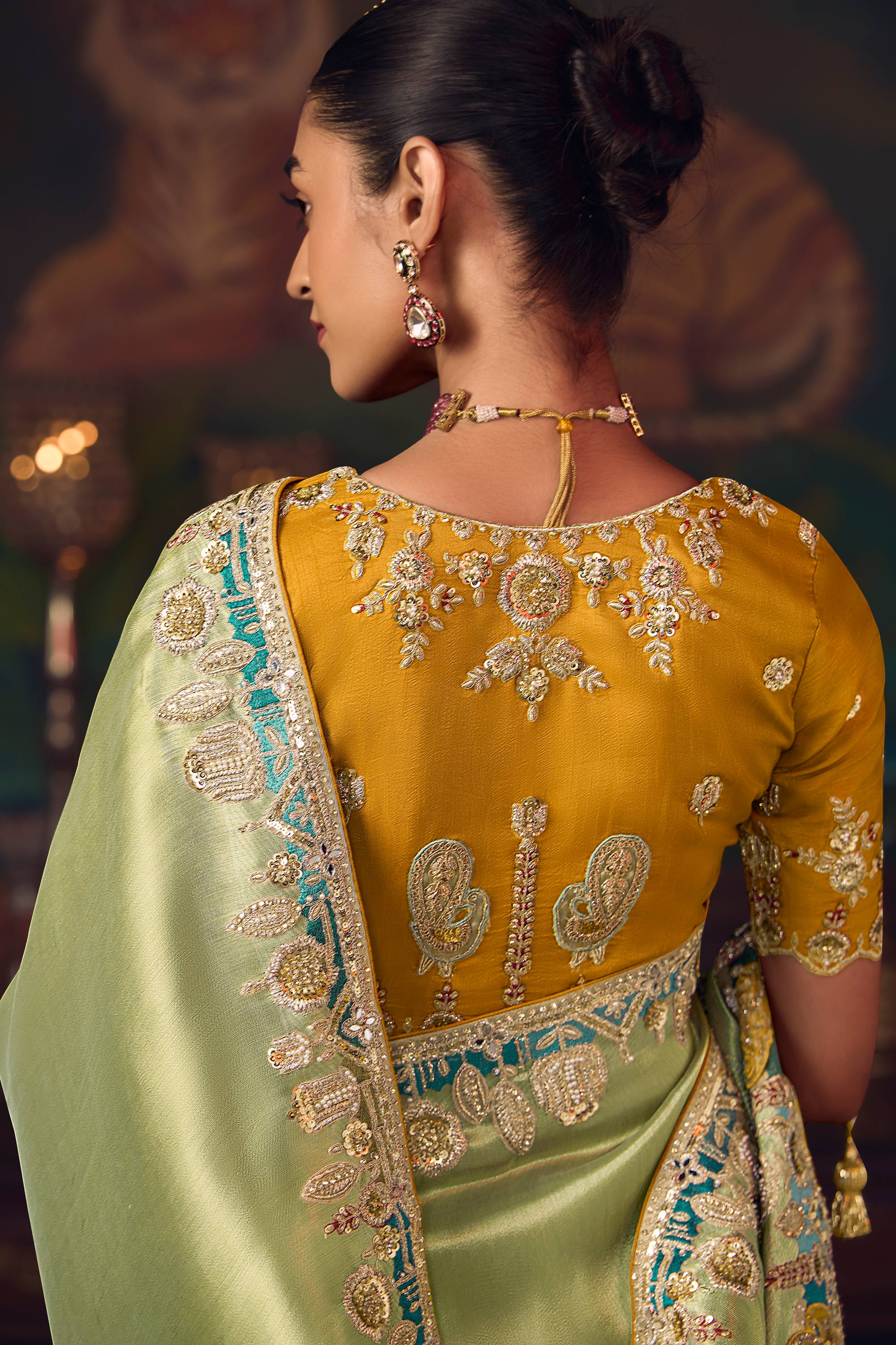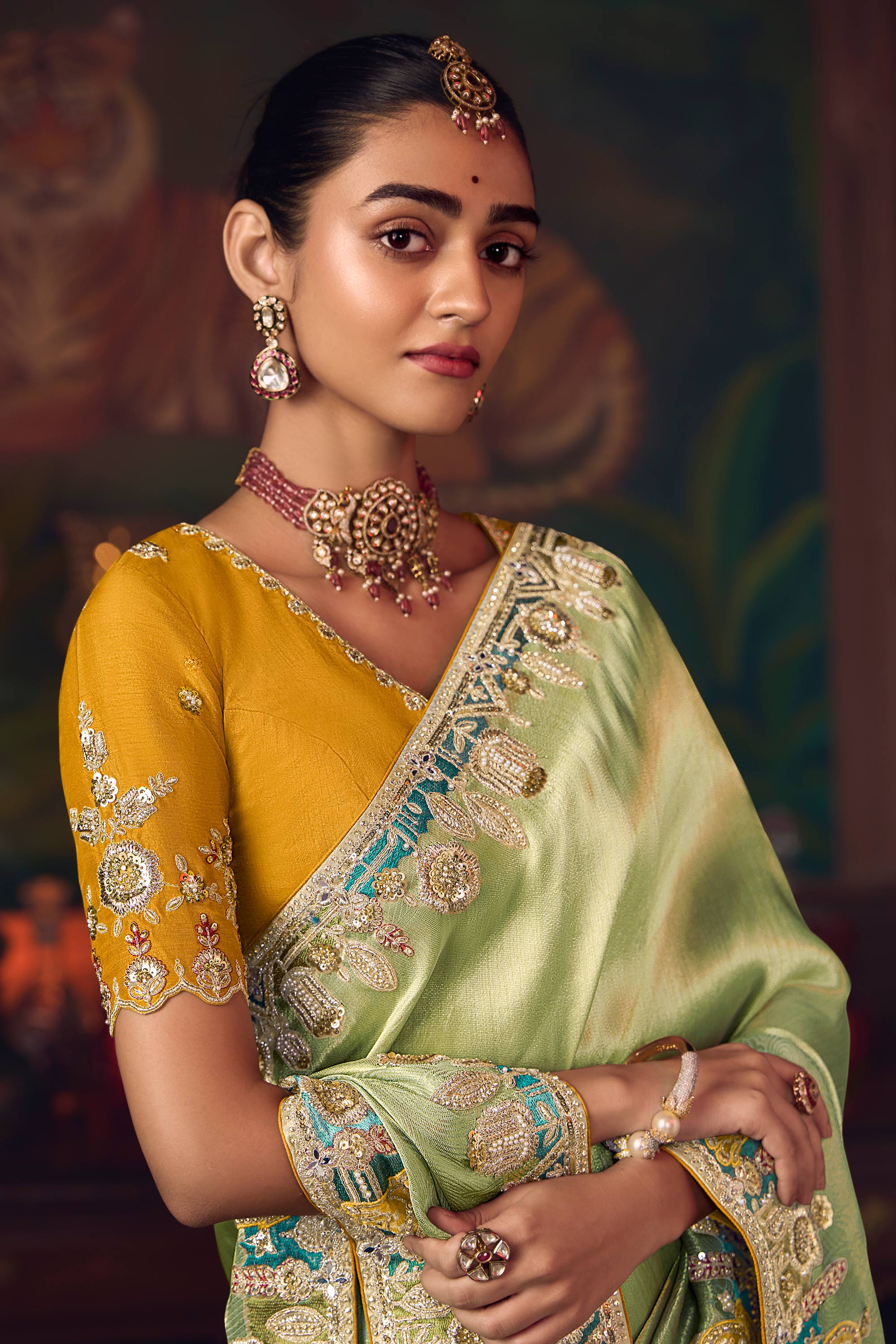Enhance your ethnic collection with this graceful Heavy Border Work Wedding Bridal Silk Saree. Featuring luxurious silk fabric adorned with intricate border craftsmanship, this saree offers timeless beauty for weddings and celebrations. Accompanied by an unstitched blouse showcasing heavy detailing, you can create a tailored fit for added elegance. Designed for women who love a blend of tradition and luxury, this saree is perfect for making a bold yet refined statement. Treat yourself to unparalleled sophistication.