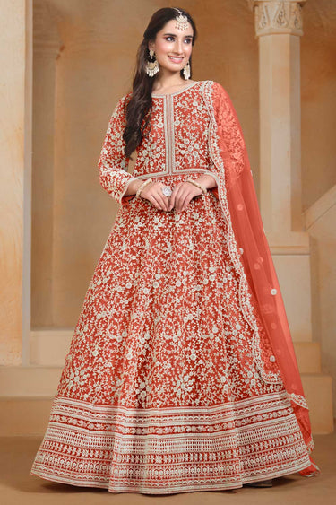 Classic Orange Color Function Style Anarkali Suit In Net Fabric