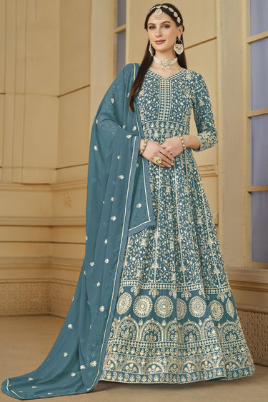 Function Wear Teal Color Embroidered Anarkali Suit In Georgette Fabric