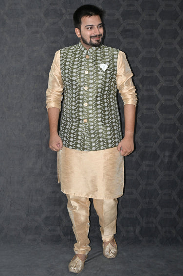 Art Silk Fabric Festive Wear Readymade Men Stylish Kurta Pyjama With Olive Color Jacket set