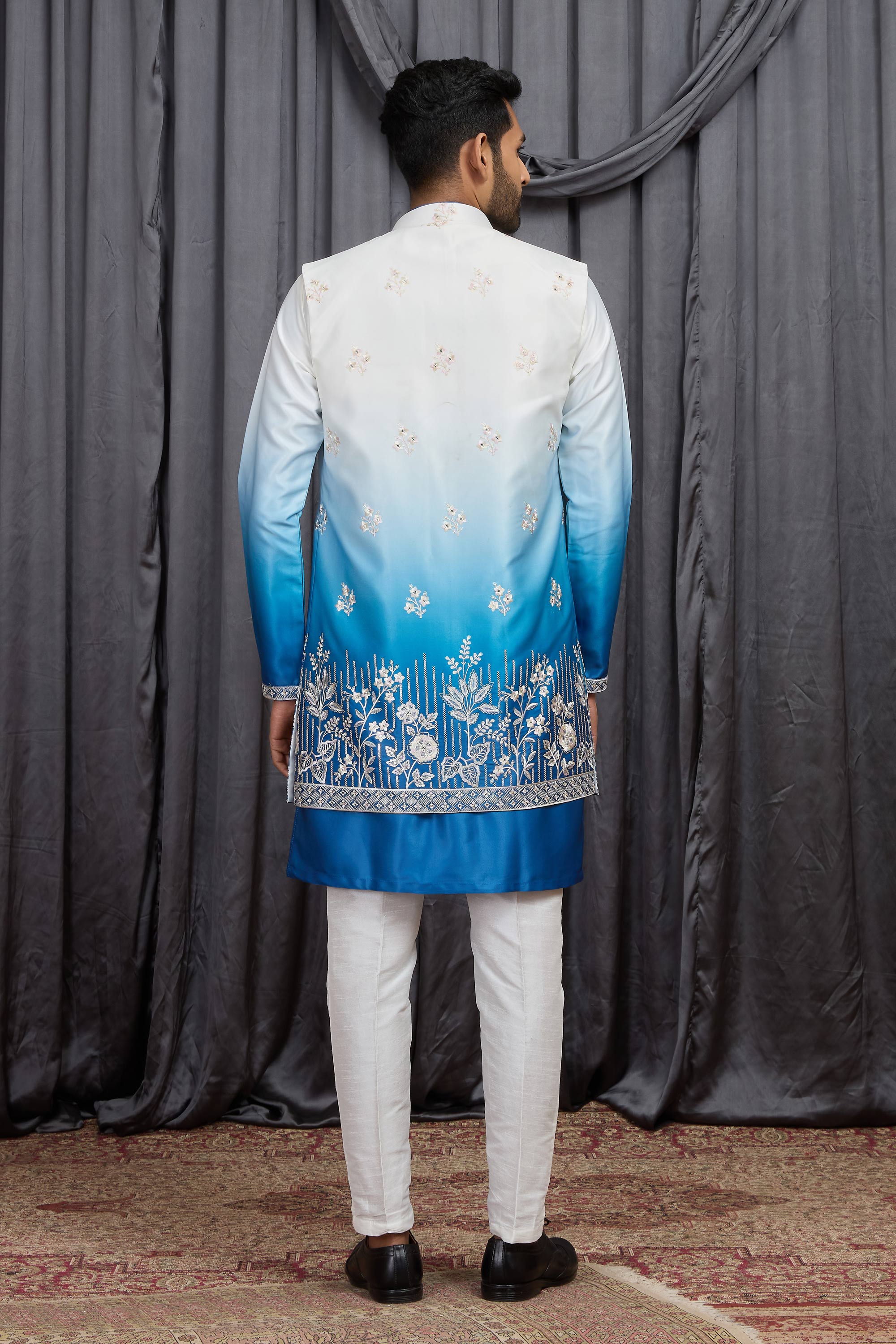 Elevate your festive look with this Mens Readymade Kurta Pyjama with Jacket, designed for sangeet and special occasions. The Art Silk kurta features elegant embroidery work and is paired with an Aligadhi style bottom in rich Art Banarasi Silk. The jacket with Faux Satin lining adds a refined touch, while the rich color enhances its celebratory appeal. Please note that due to digital photography, slight color variations may occur.