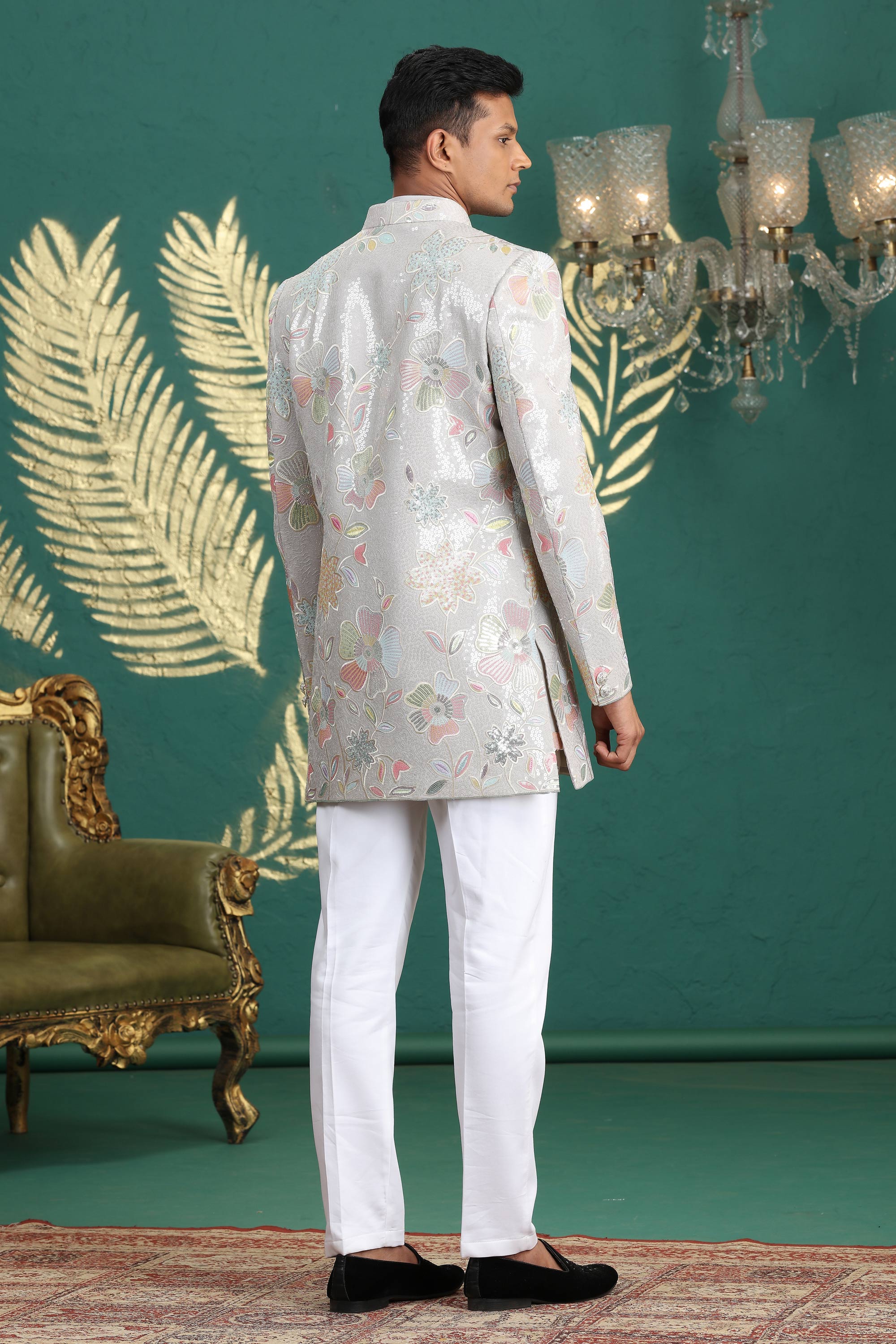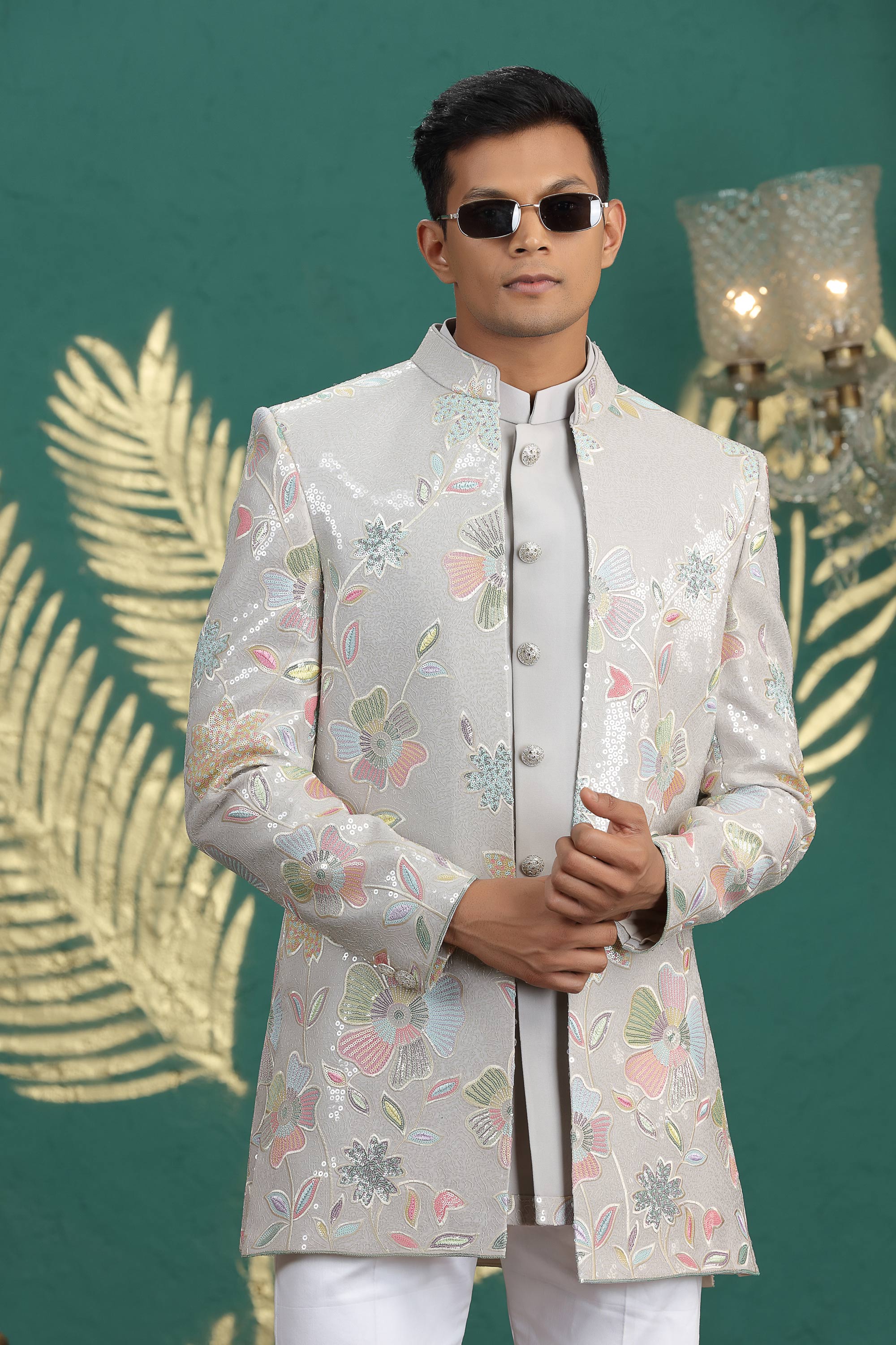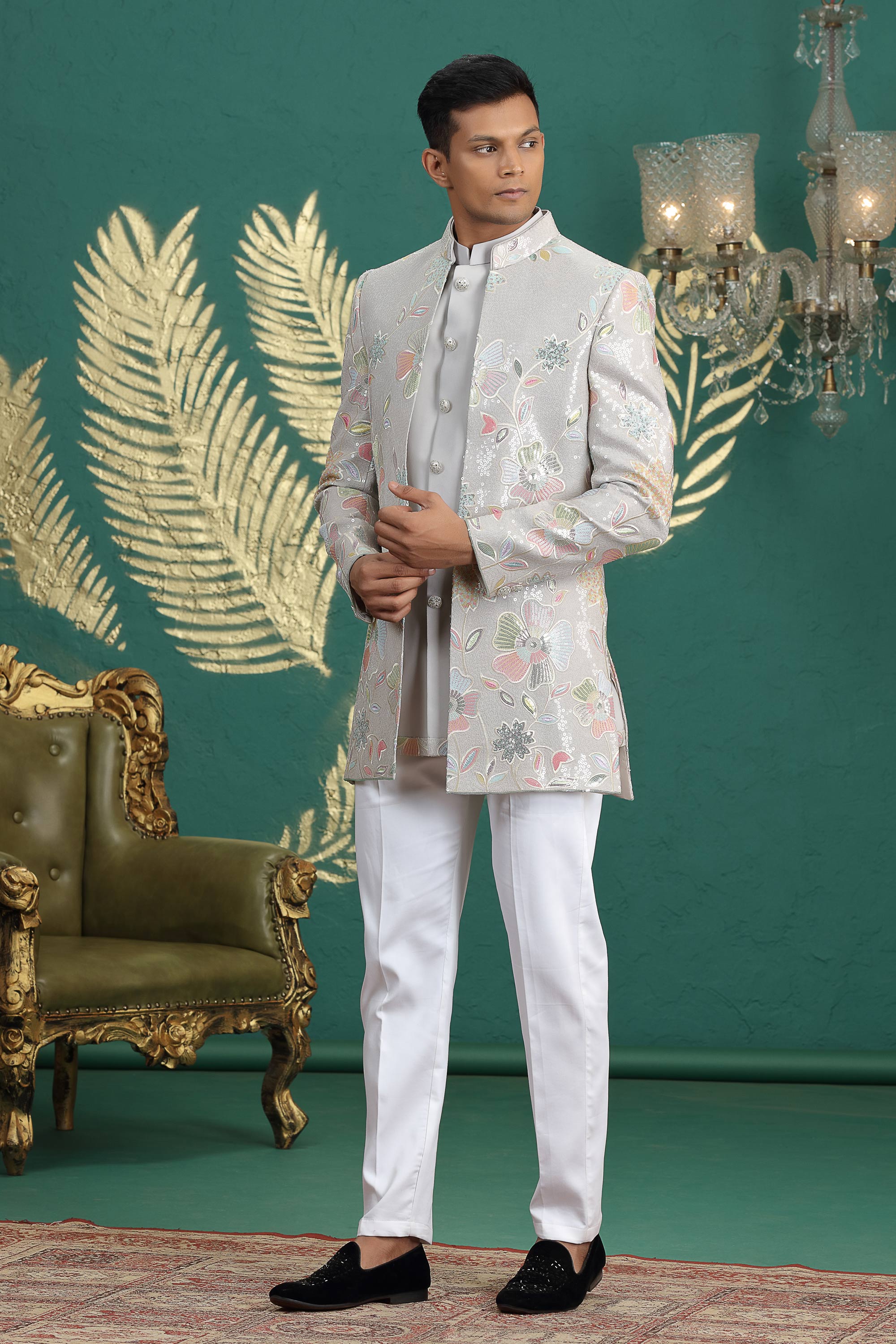 Art Silk Grey Wedding Wear 3 Piece Indo Western For Men