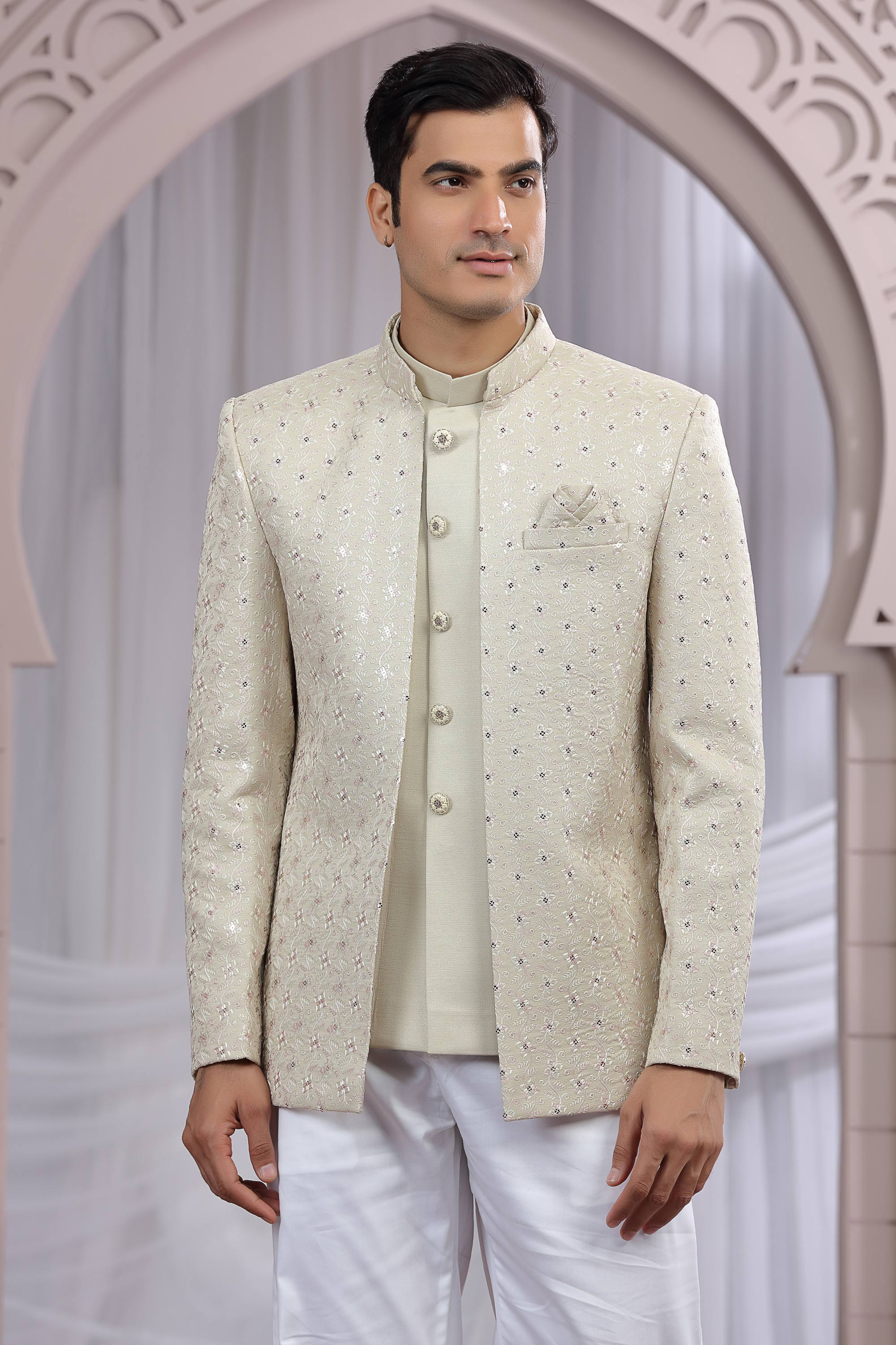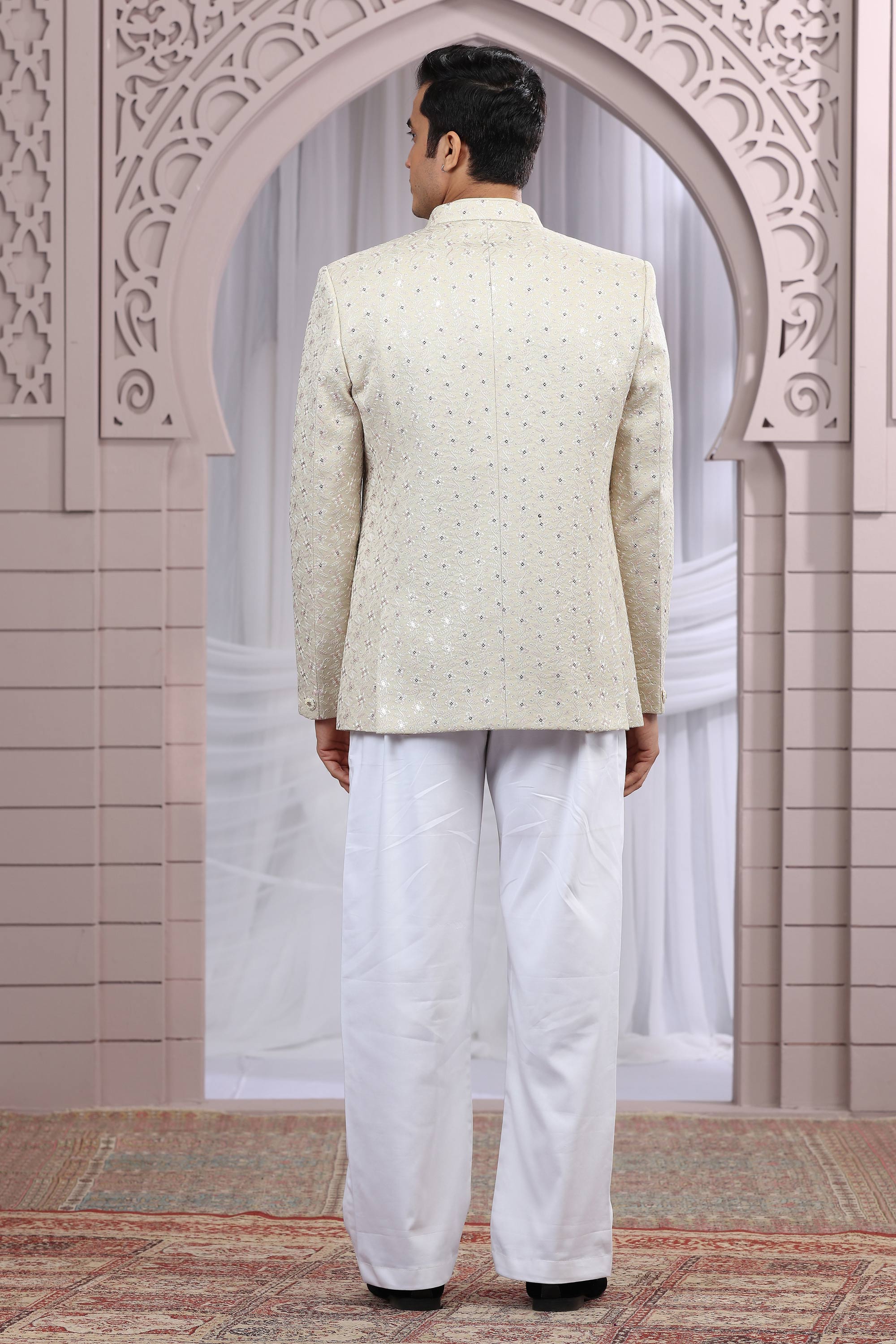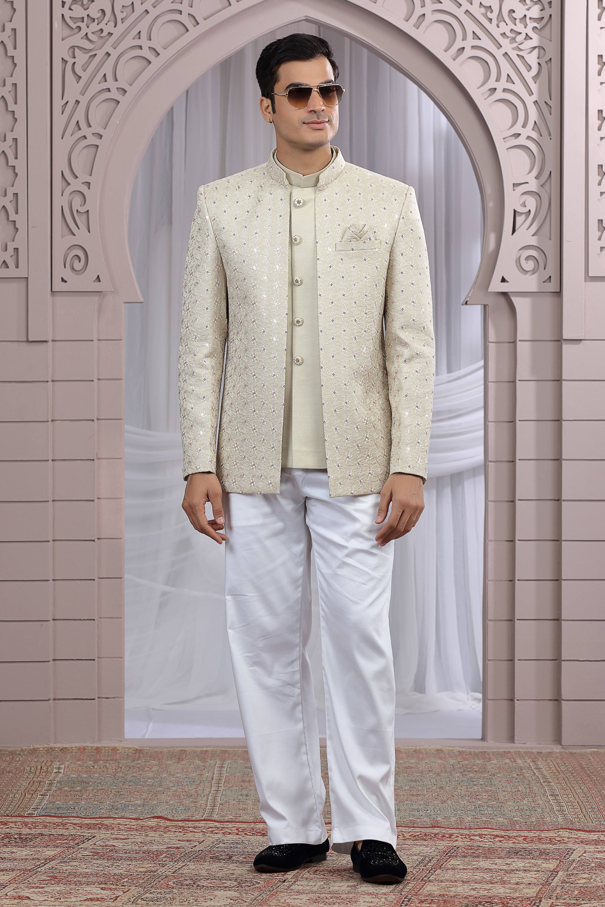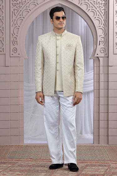 Beige Pretty Art Silk Wedding Wear Readymade Men Indo Western Jodhpuri Suit