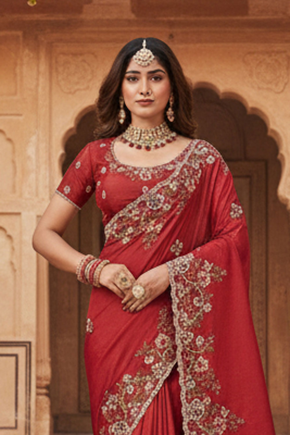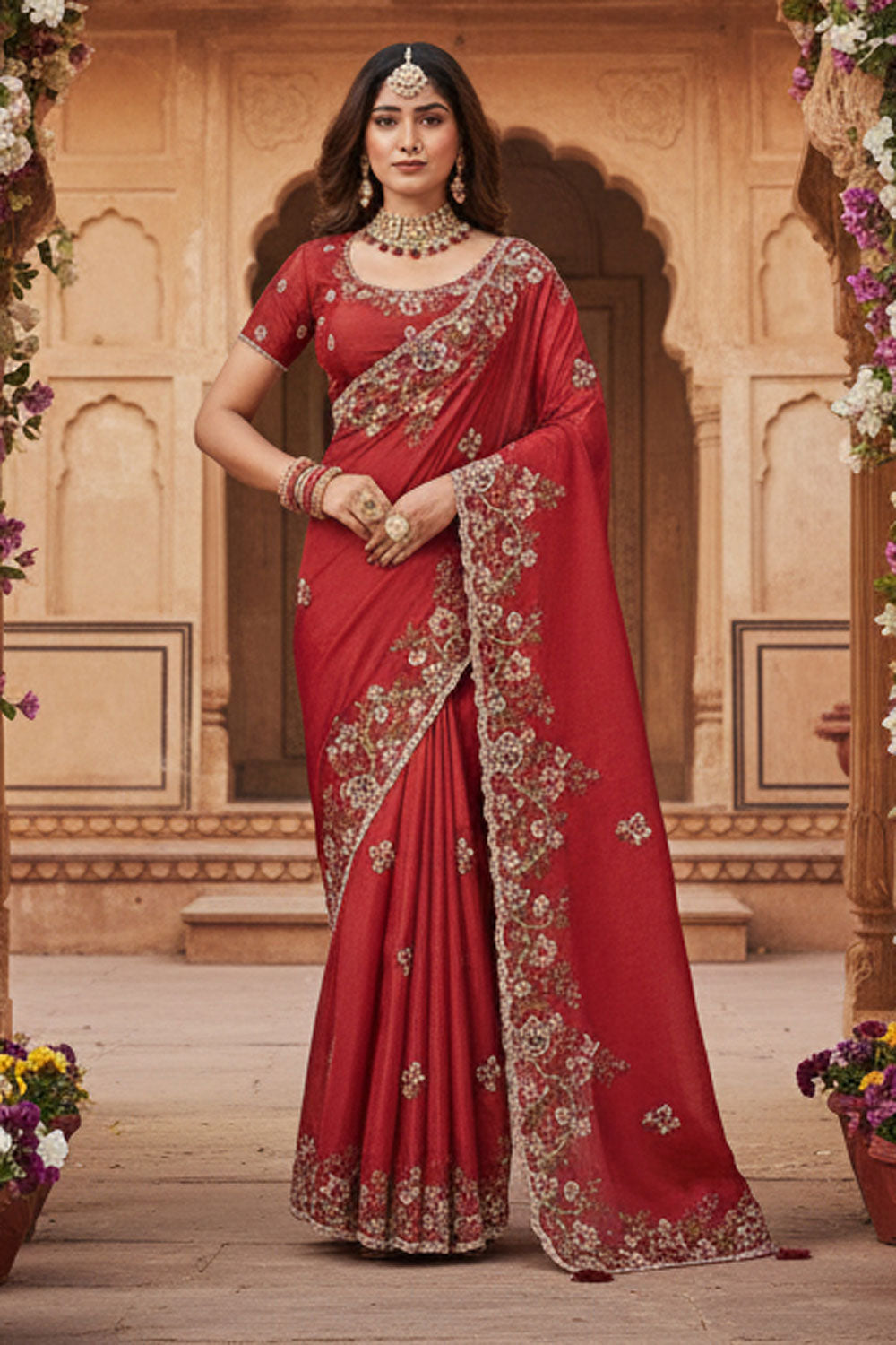 Art Silk Fabric Red Color Delicate Saree With Fancy Work