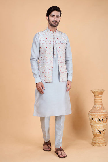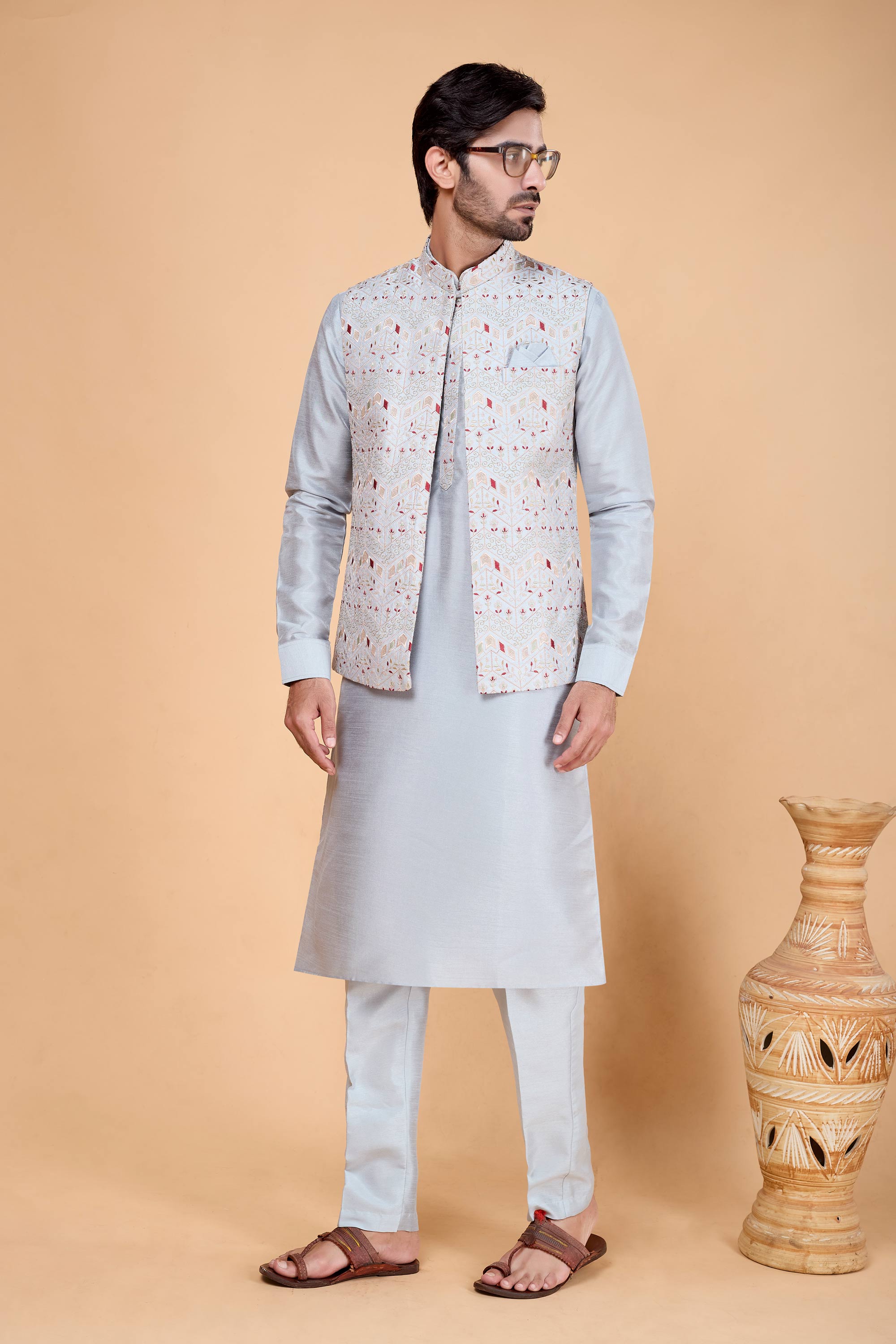Art Silk Grey Men Readymade Kurta And Aligadhi Pant With 3 Pcs Jacket Set For Wedding Wear