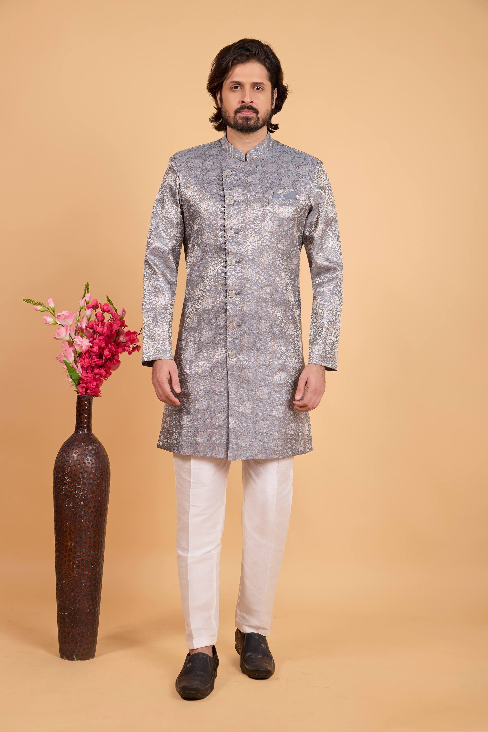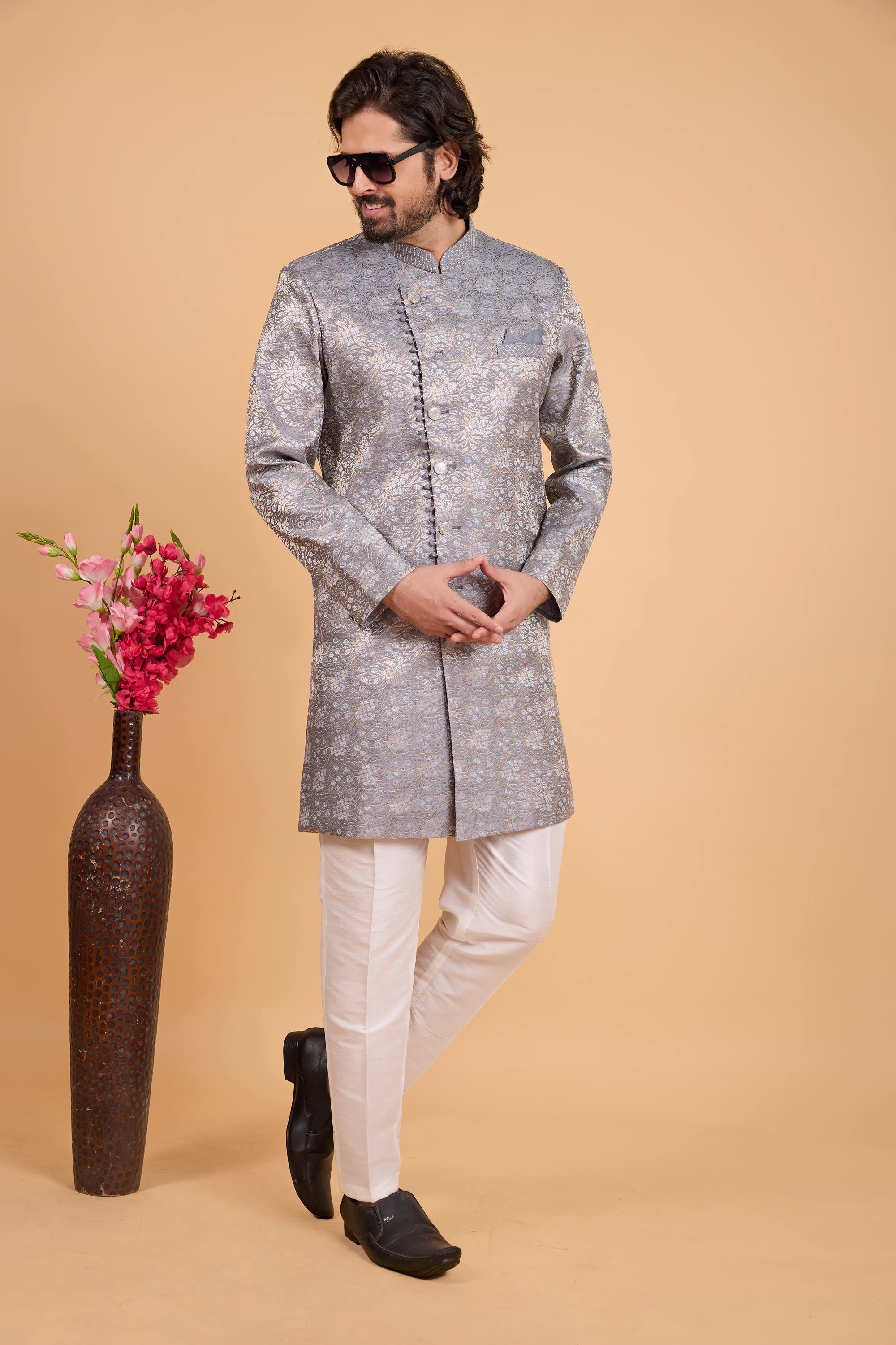 Art Silk Grey Wedding Wear Readymade Indowestern And Aligadhi Pant For Men