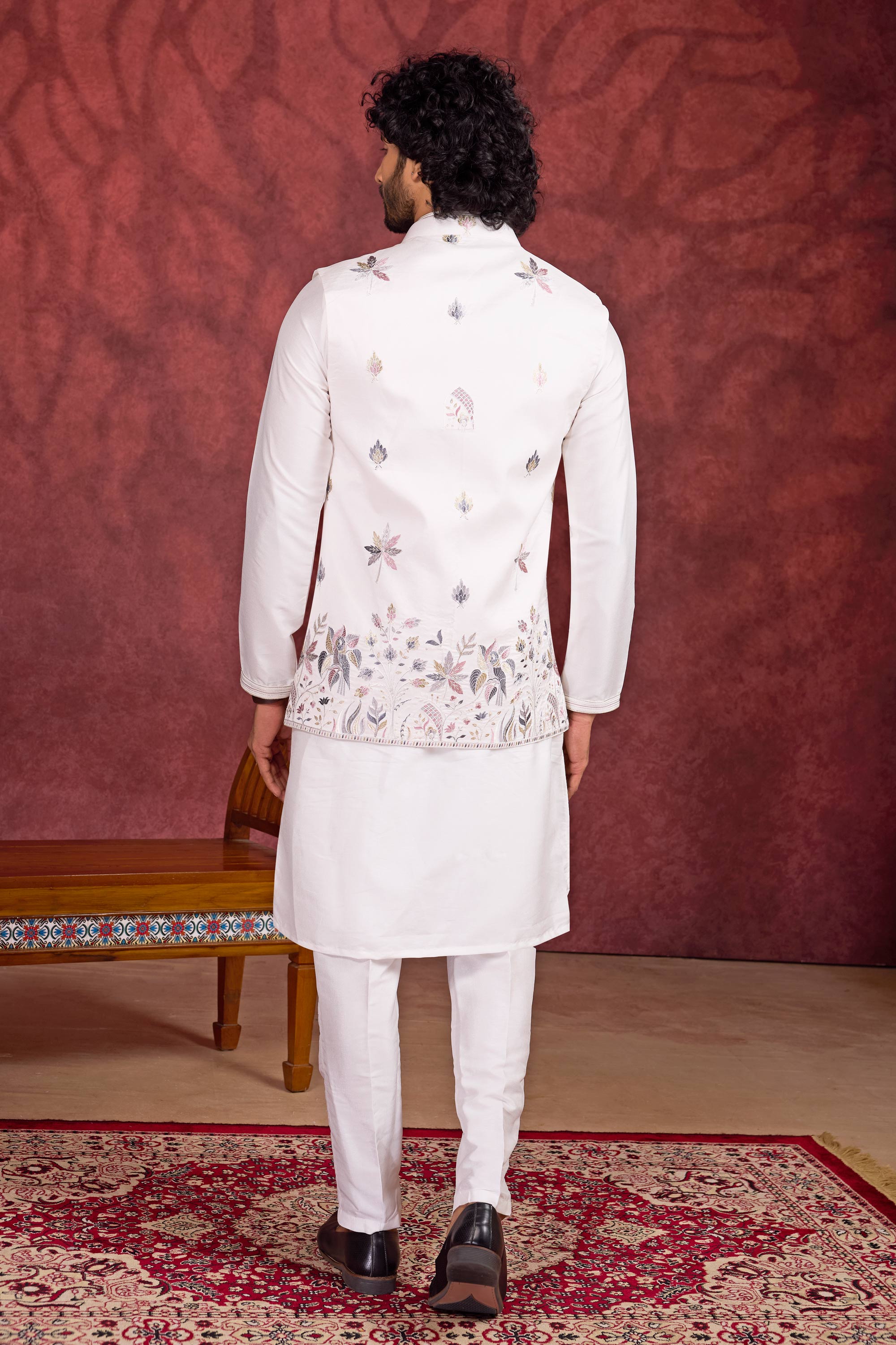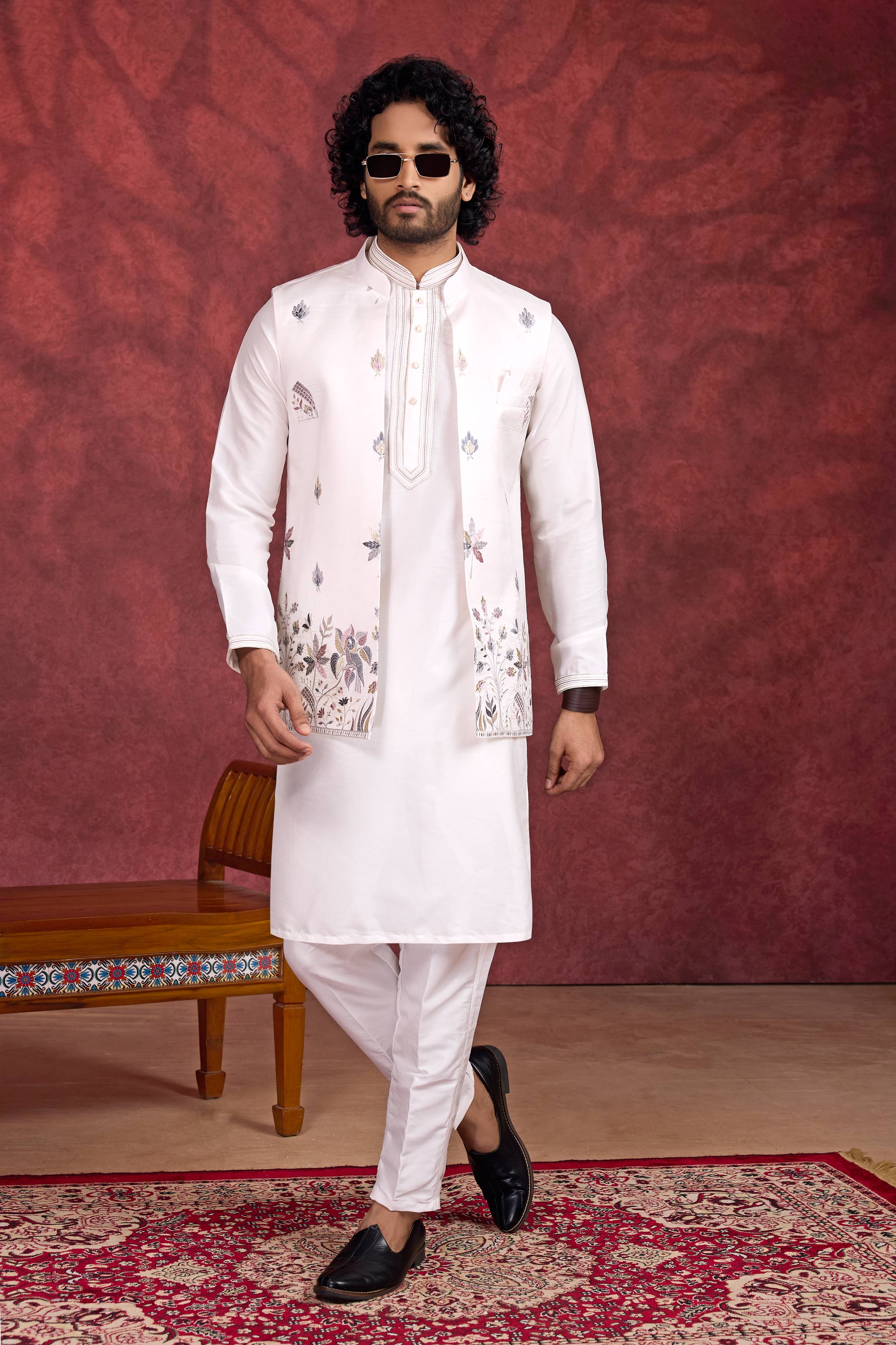 Art Silk Off White Wedding Wear Readymade Kurta And Aligadhi Pant For Men