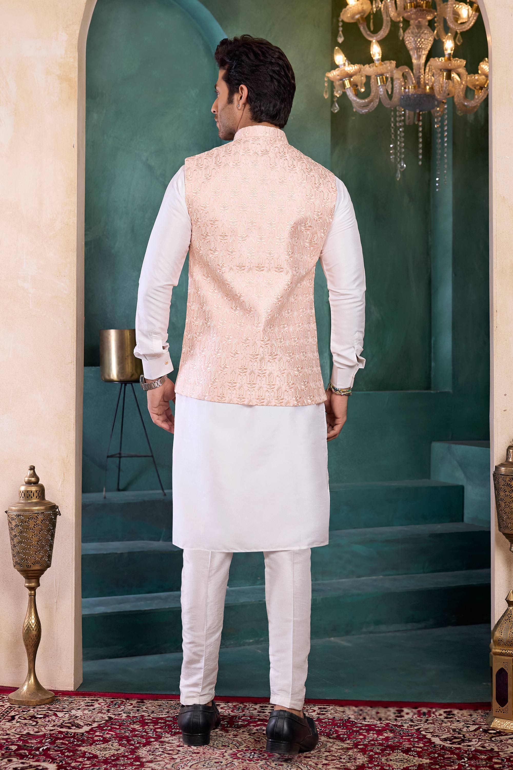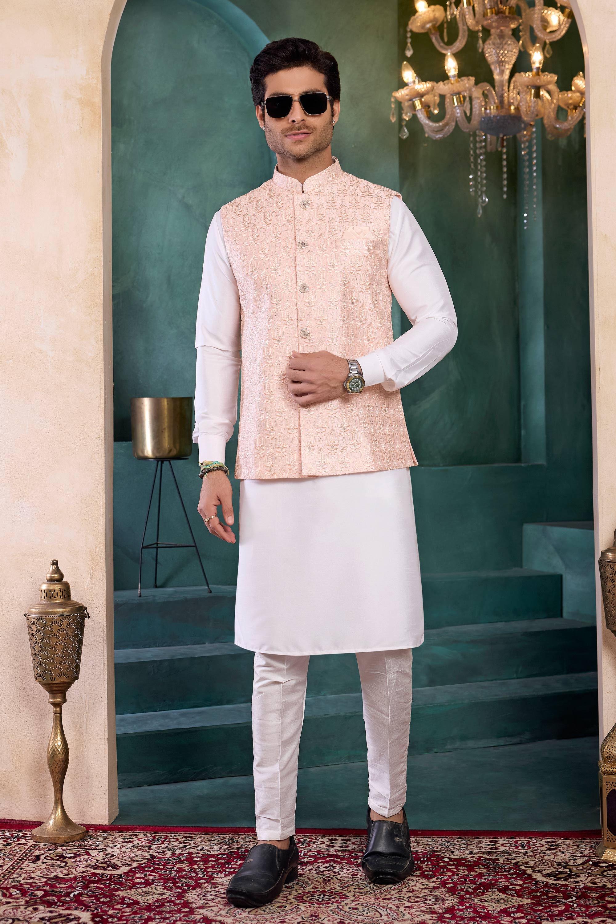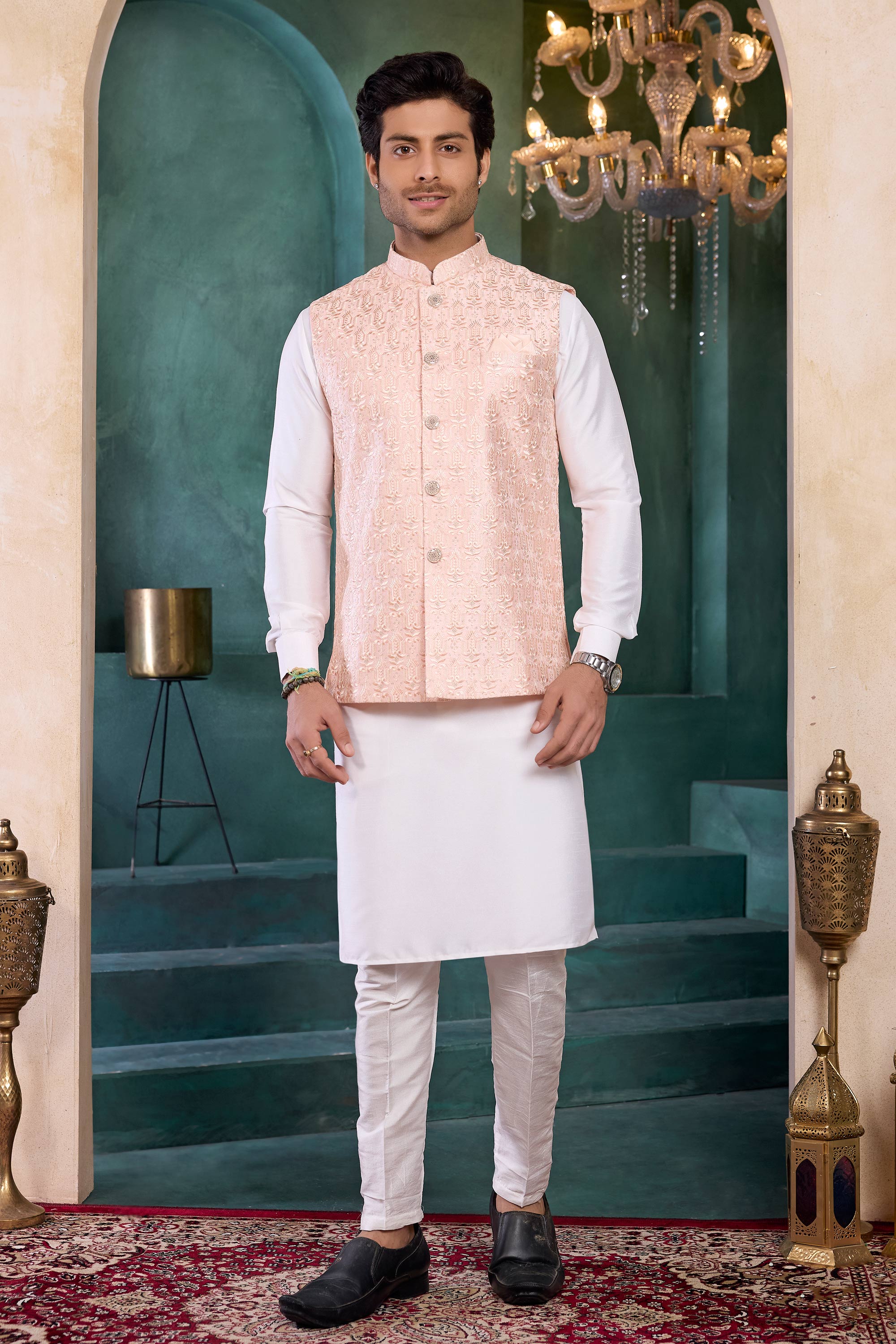 Turn heads at any celebration with this Gorgeous Reach Color Wedding Function Designer Readymade Mens 3-Piece Kurta Set. Perfectly tailored for elegance and comfort, this outfit includes a premium kurta, a chic jacket, and Aligadhi-style pants. Crafted with high-quality fabric, it is breathable, stylish, and designed to make you stand out during festive gatherings or wedding ceremonies. The beautiful color and intricate details on the jacket give it a modern yet traditional charm. Easy to wear and lightweight, this ready-to-wear ensemble is perfect for men seeking sophistication with minimal effort. Elevate your ethnic wardrobe with this classy piece today!