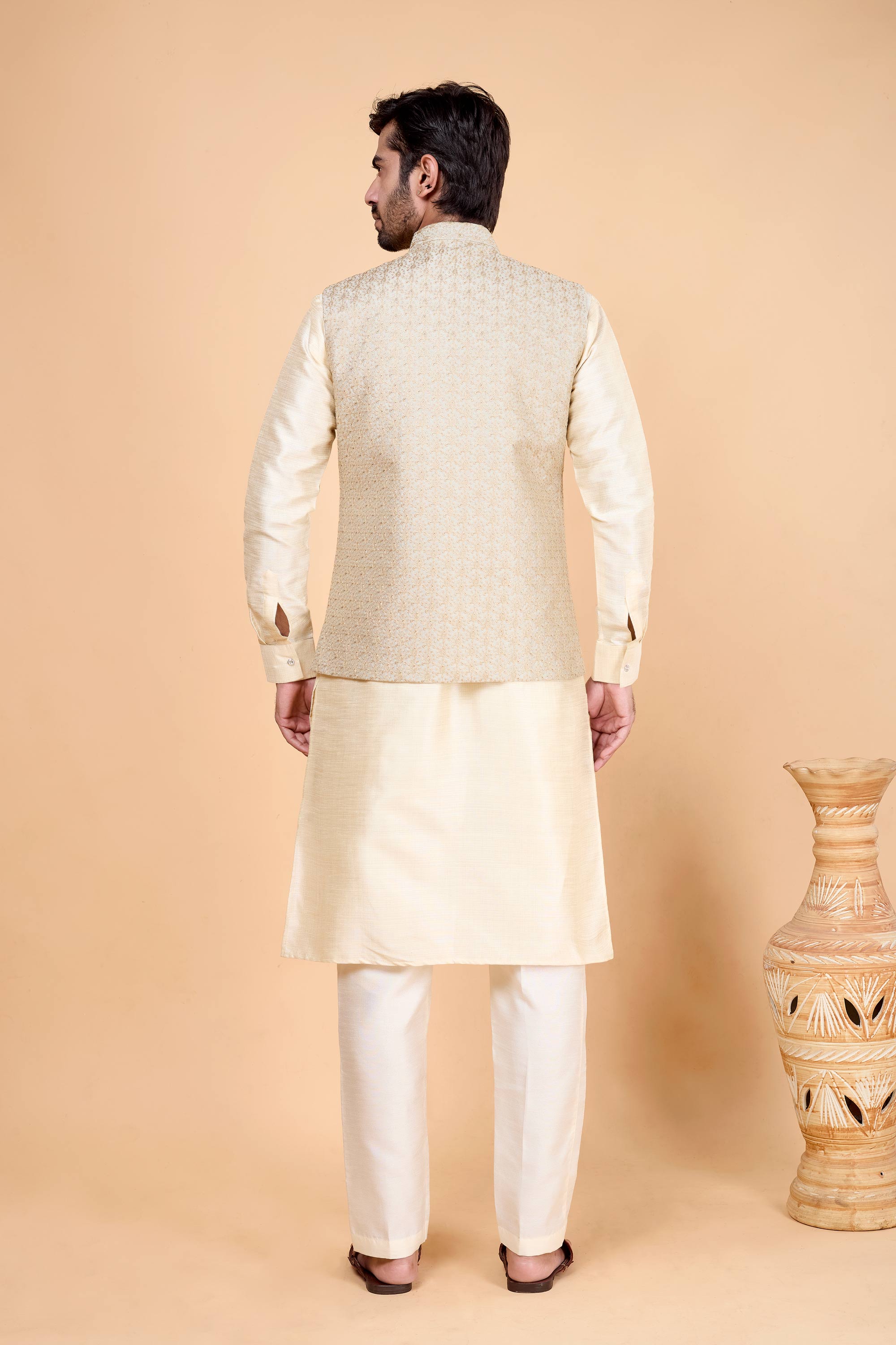 Step into any occasion with grace wearing this remarkable 3-piece set for men. Featuring a pre-stitched kurta, tailored jacket, and traditional Aligadhi pants, this outfit is designed to make an impression at weddings, engagements, and family gatherings. The soft and breathable fabric is comfortable for long hours, while its polished design gives it a sophisticated and eye-catching look. Designed with ease of wear in mind, it requires no alterations, letting you save time and focus on looking your best. This ready-to-wear attire brings traditional clothing into modern style seamlessly.