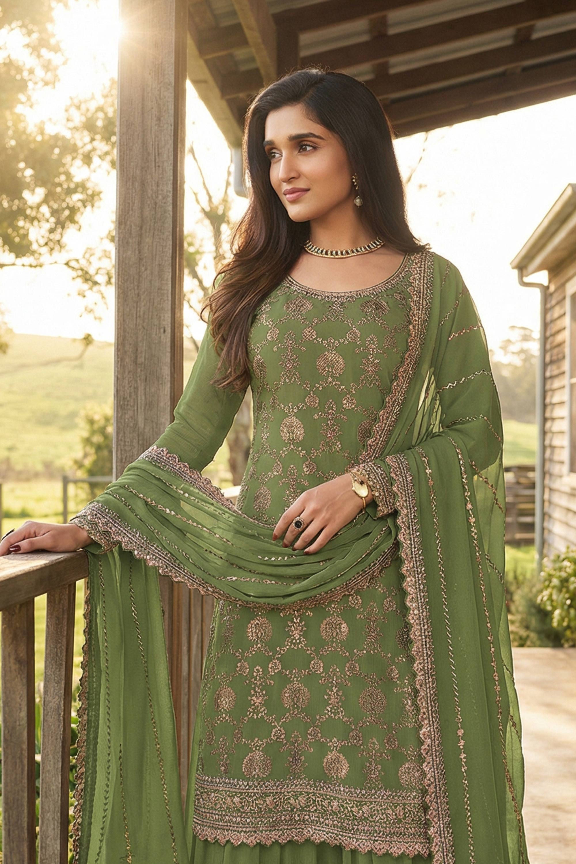 Nidhi Shah Embroidered Chinon Green Readymade Palazzo Salwar Kameez