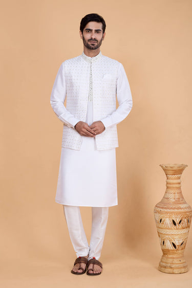 Off White Wedding Wear Readymade Kurta And Aligadhi Pant With Embroidered Jacket For Men