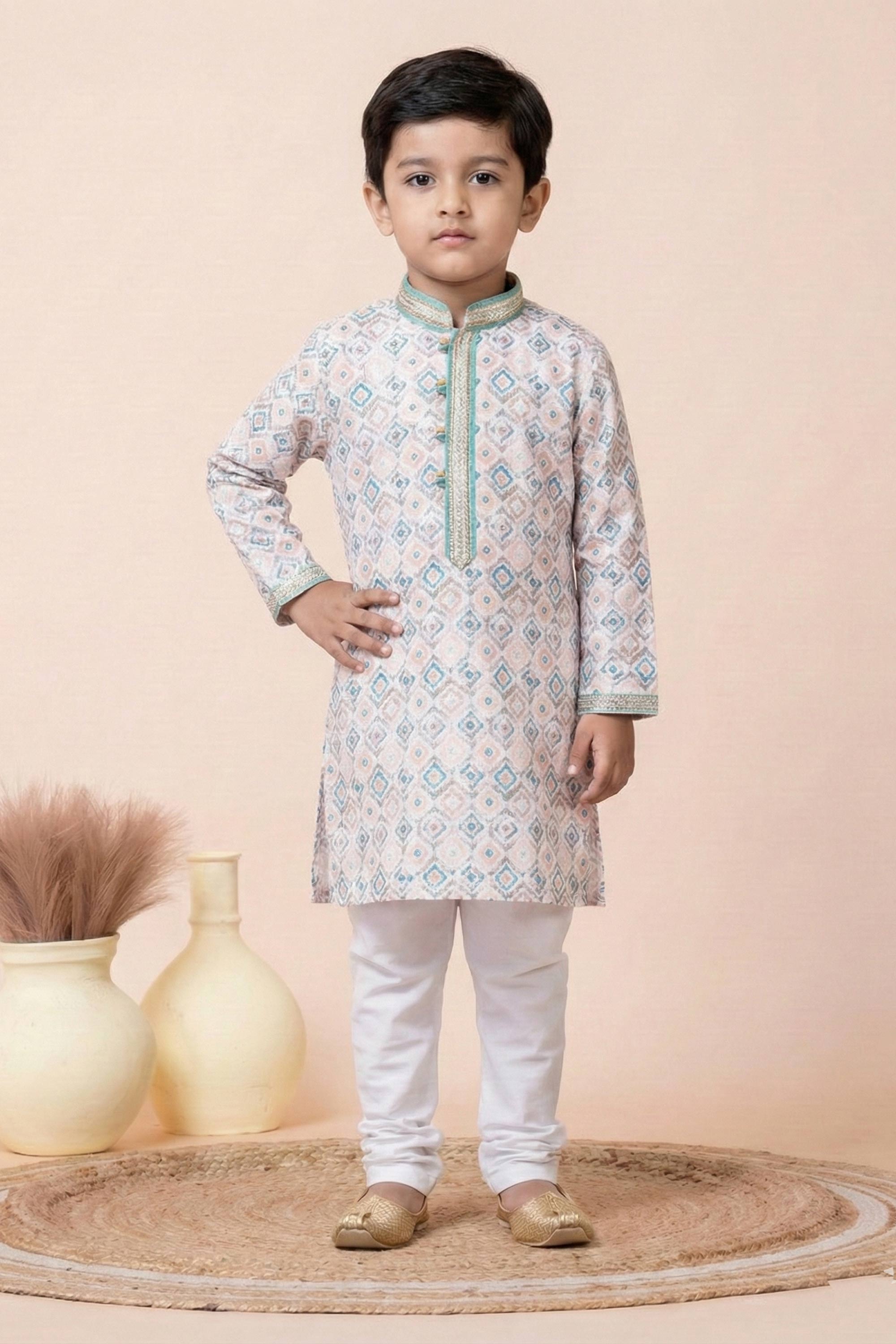 Dress your little one in our Appealing Reach Color Function Wear Designer Readymade Kurta Pyjama For Boys and bring comfort and style to their special occasions. Perfectly designed with high-quality fabric, this ready-to-wear set offers a soft, breathable fit that keeps your child comfortable all day. Featuring a contemporary design with a traditional touch, this outfit is suitable for festive celebrations, weddings, or family gatherings. The unique color combination and premium craftsmanship add a charming touch to the look. With an easy-to-wear design, its a convenient yet stylish option for boys who love looking sharp while staying comfortable.