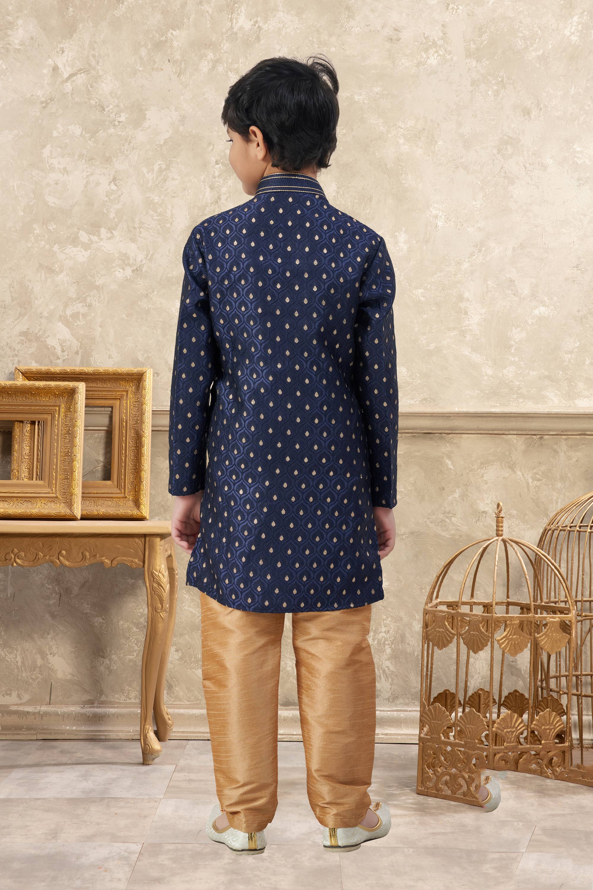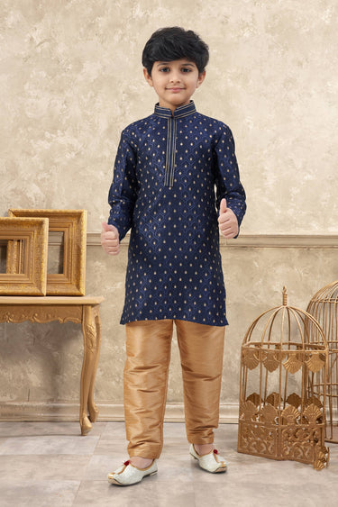 Jacquard Fabric Navy Blue Boys Readymade Kurta Pyjama For Sangeet Wear