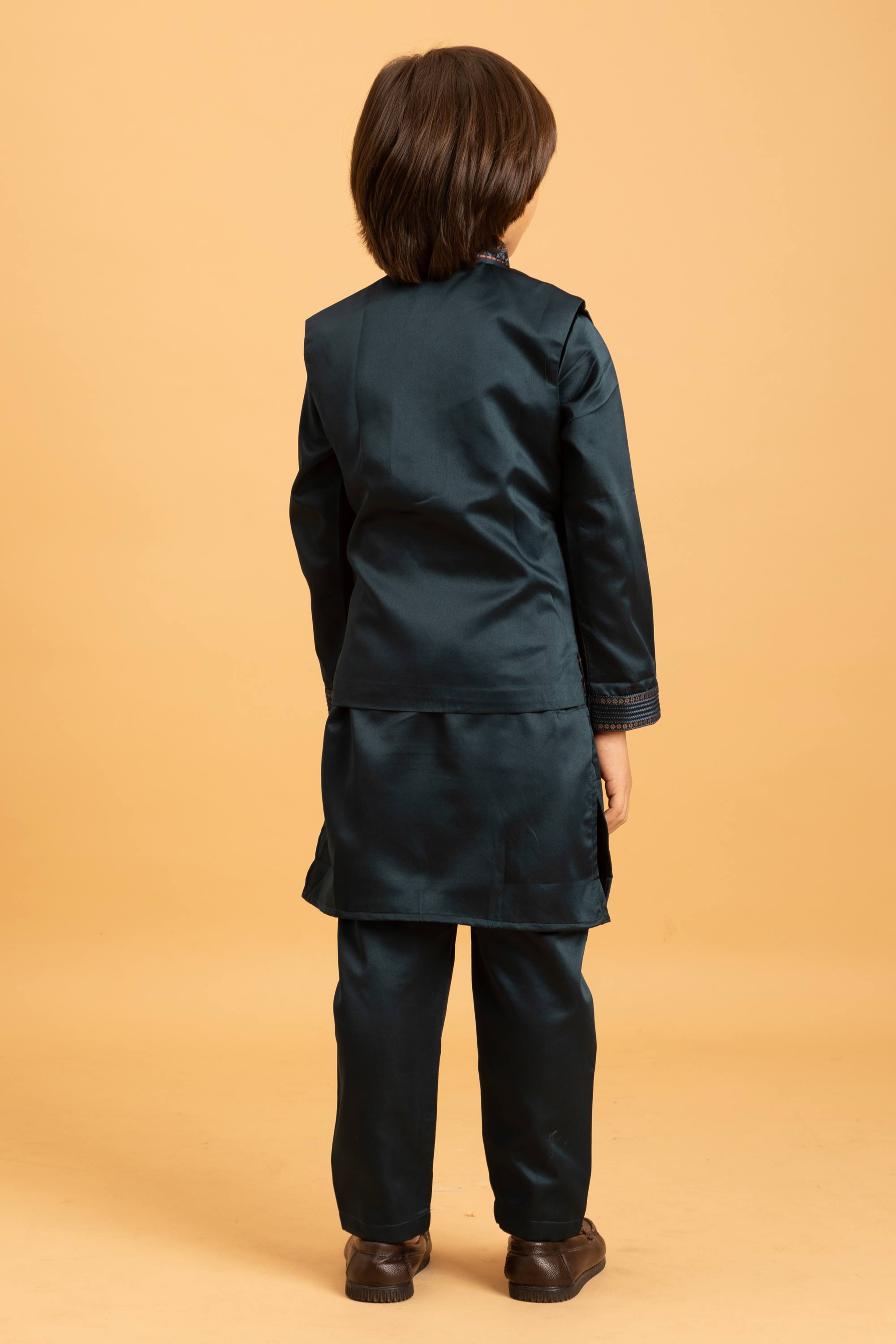 Satin Dark Teal Wedding Wear Boys Readymade Kurta Pyjama With Jacket