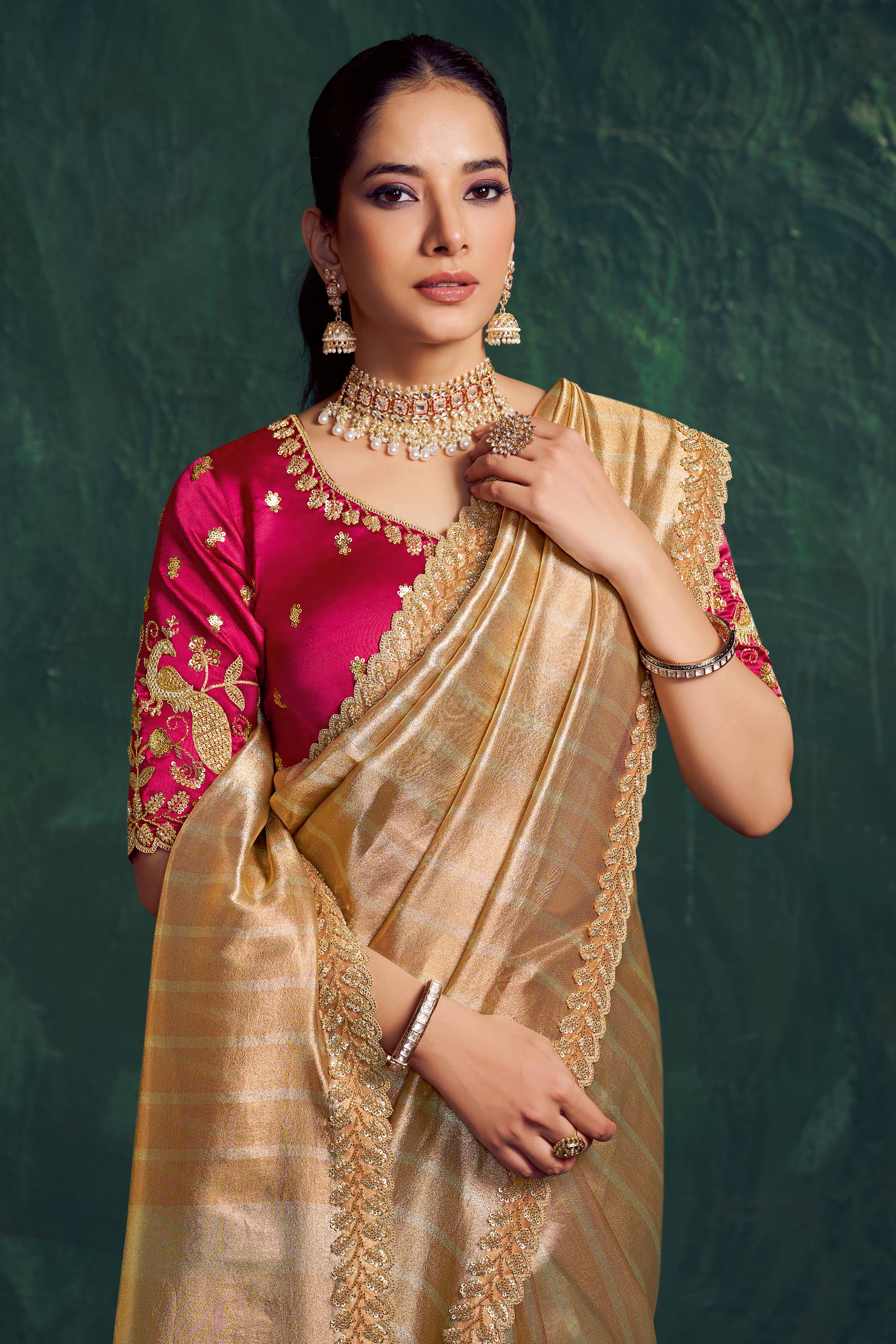 Tissue Embroidered Border Work Beige Saree For Wedding Wear