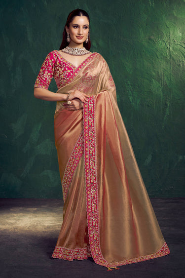 Tissue Silk Embroidered Border Work Peach Readymade Wedding Wear Saree