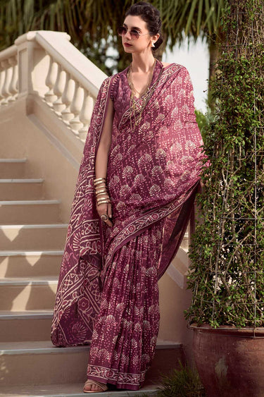 Creative Printed Work On Saree In Wine Color Art Silk Fabric