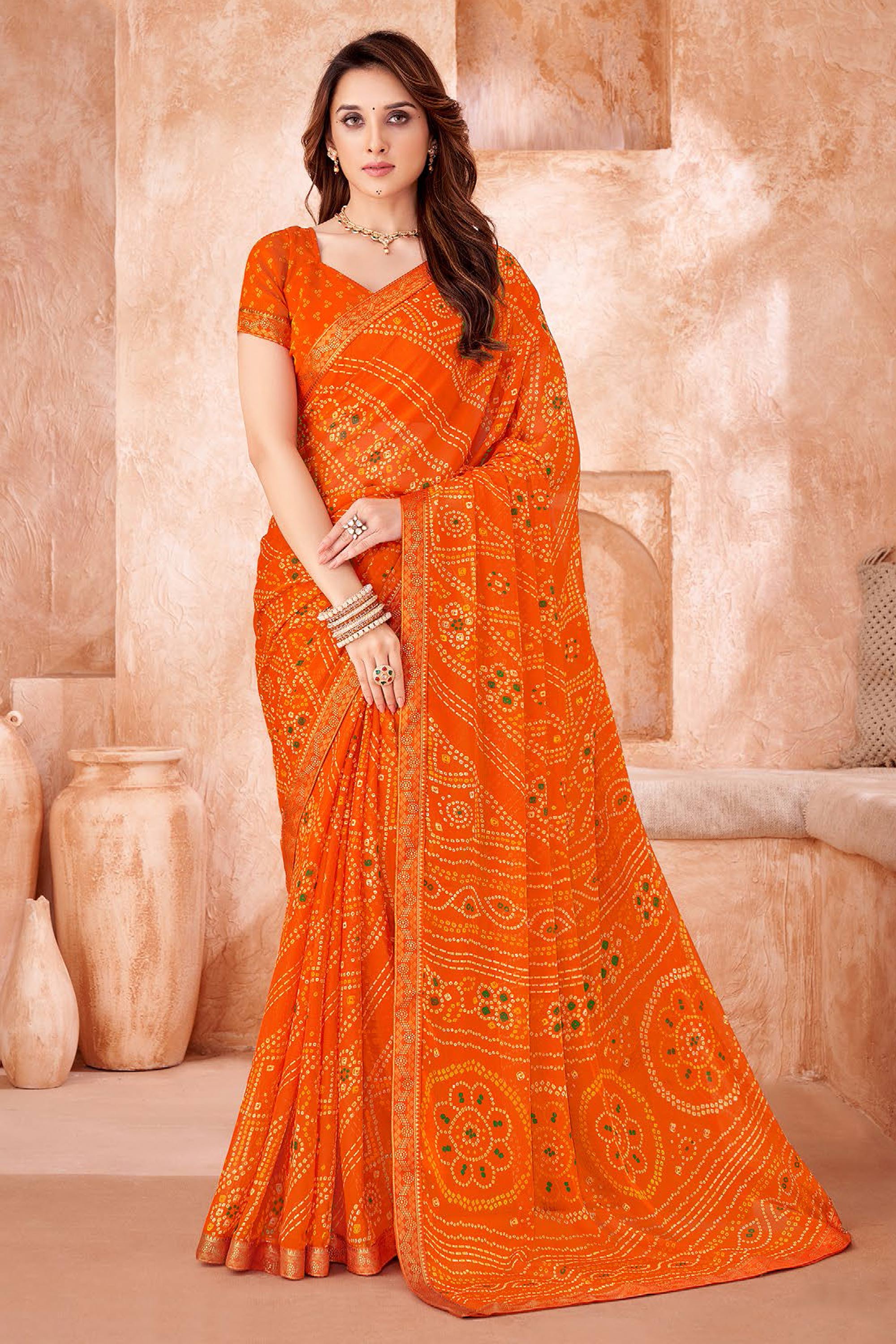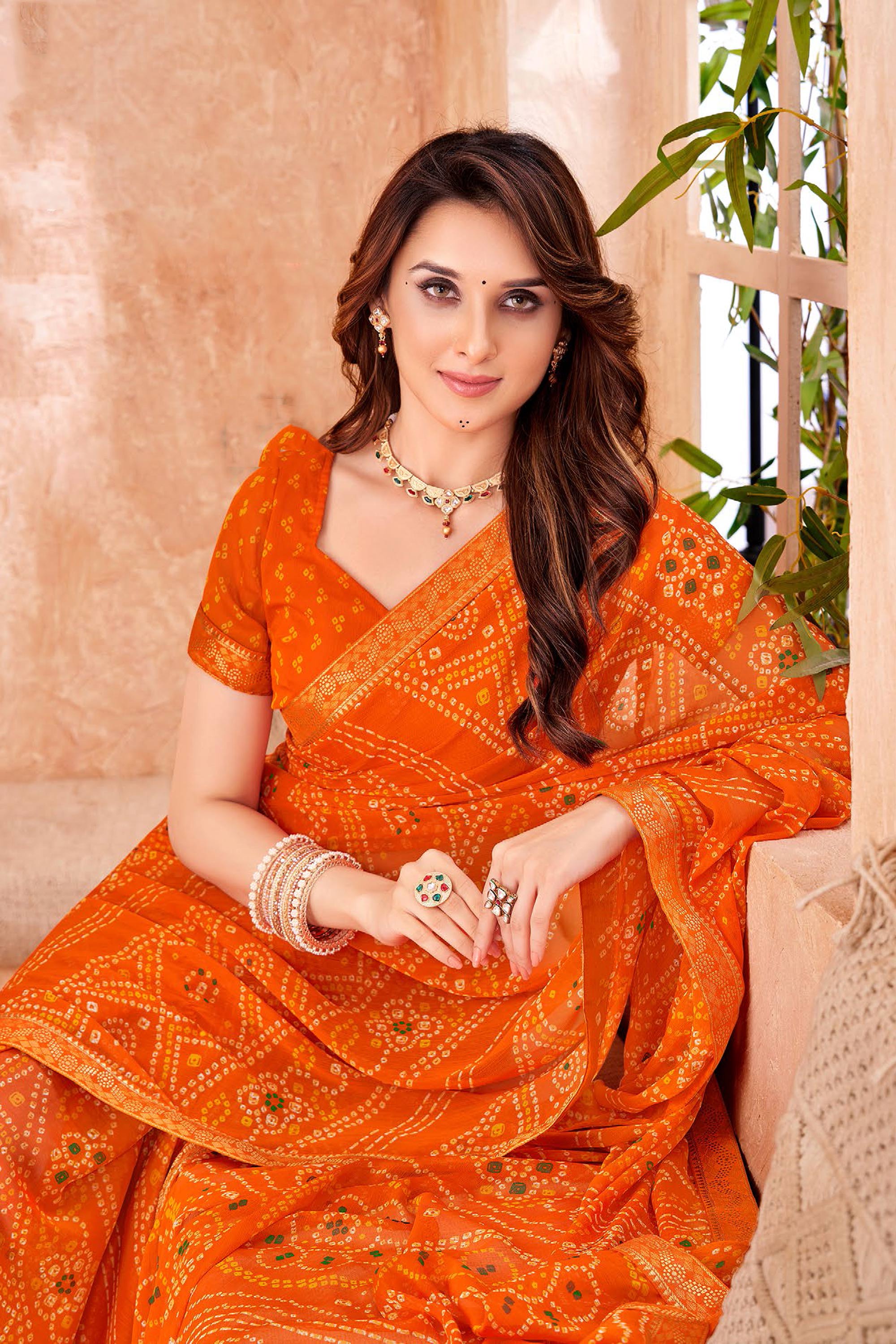 Chiffon Orange Bandhani Print Saree