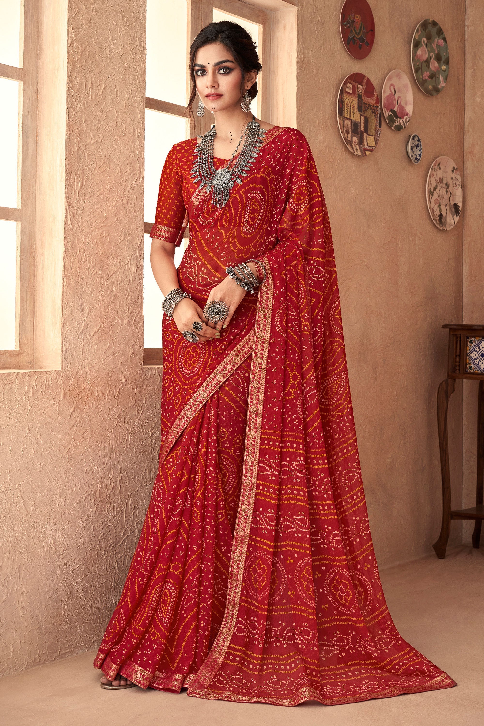 Chiffon Red Bandhani Print Attached Banarasi Border Saree