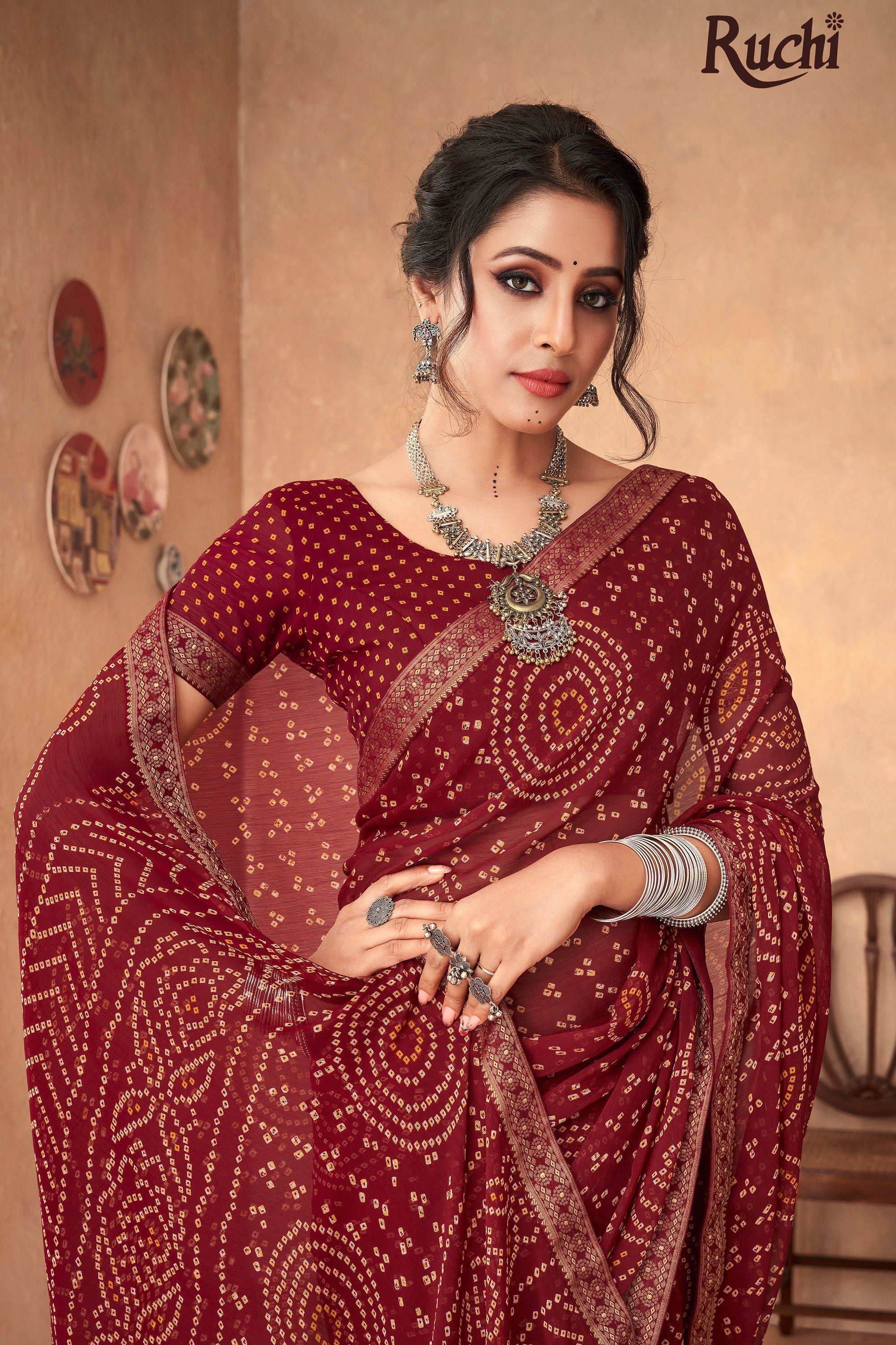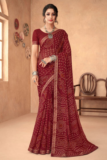 Maroon Chiffon Bandhani Print Attached Banarasi Border Saree