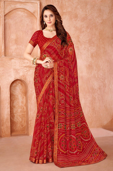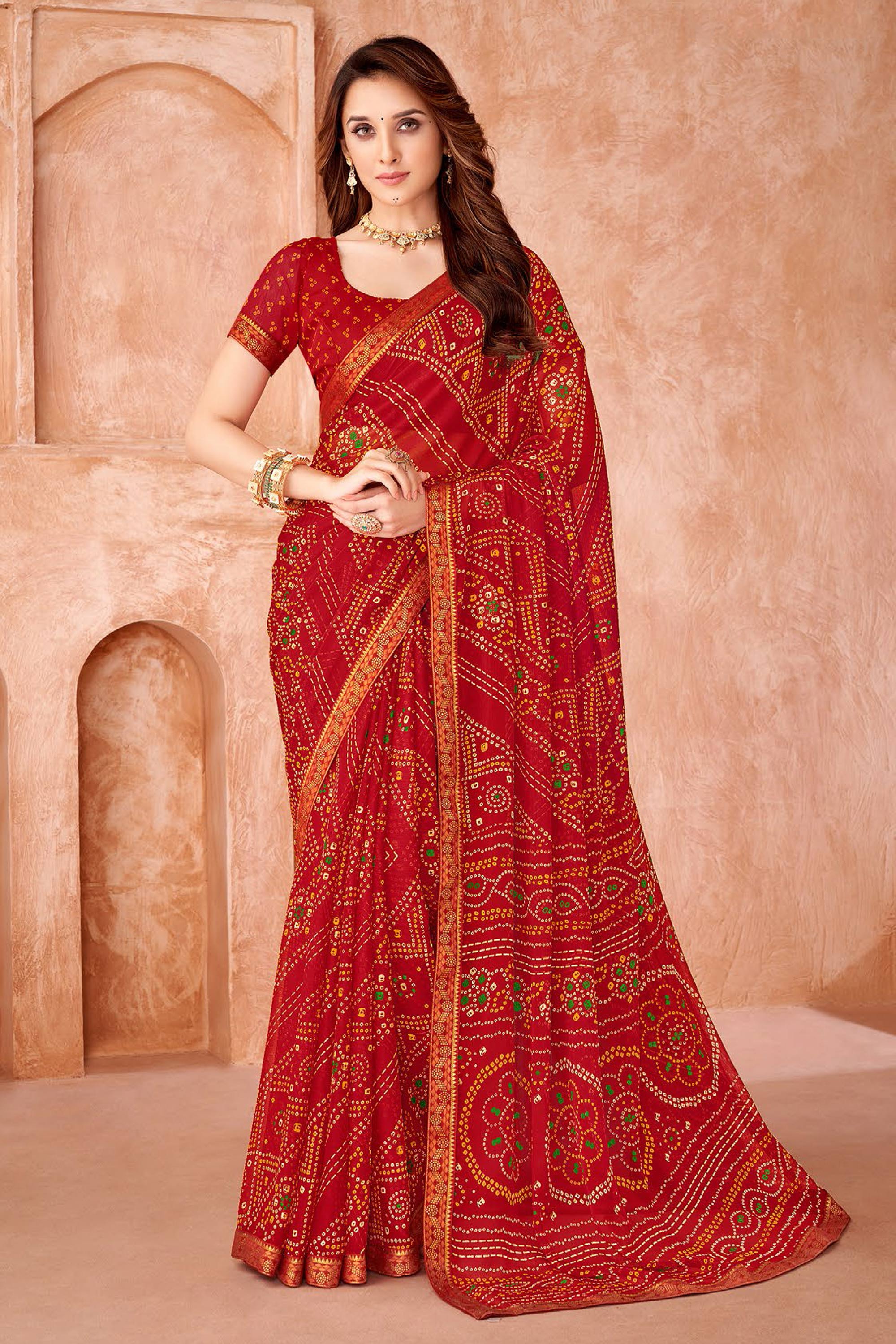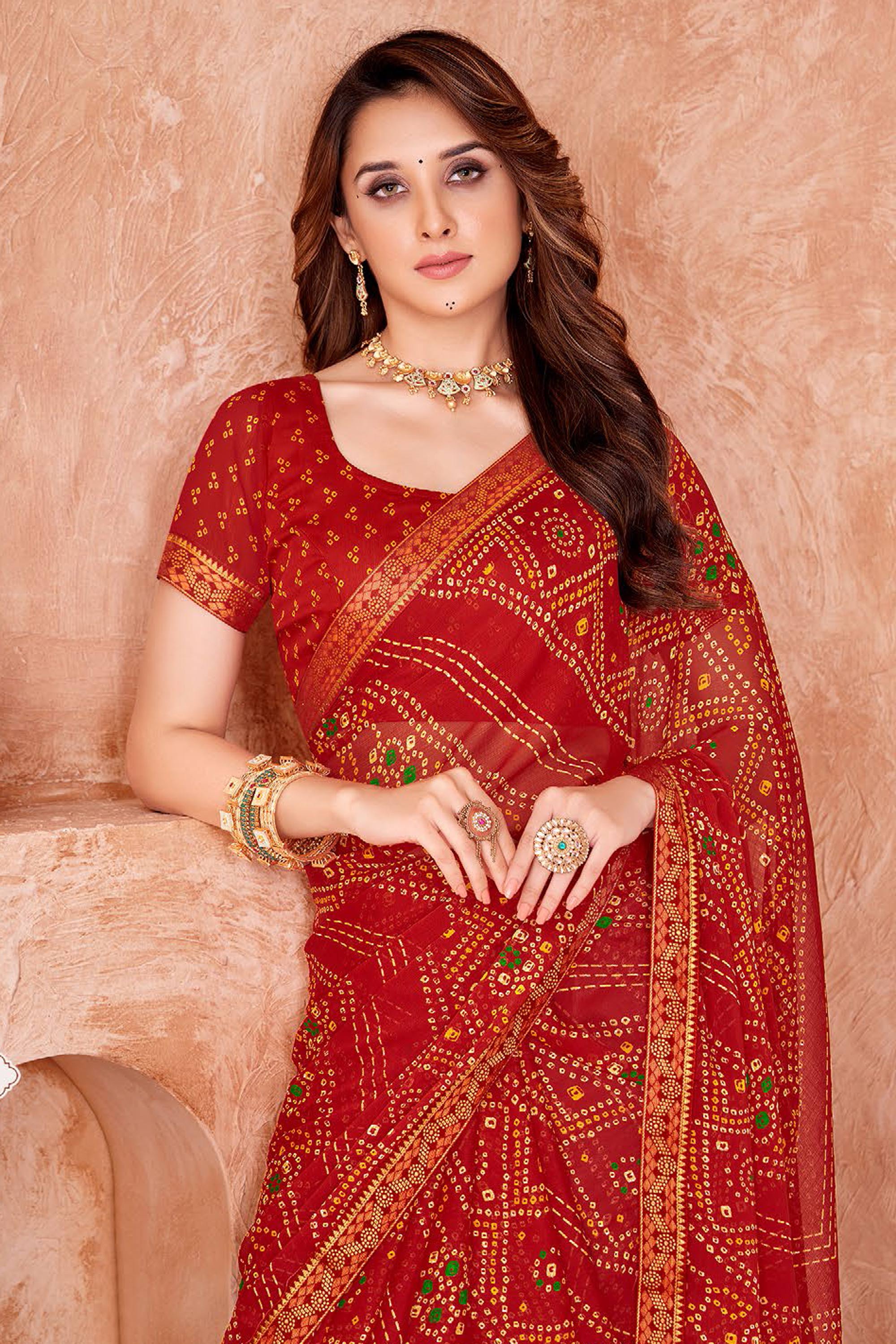 Bring grace to your daily wardrobe with this stunning Bandhej Print Chiffon Saree, complete with a matching blouse piece. Crafted from lightweight chiffon, this saree ensures a comfortable fit for all-day wear while radiating elegance. The Bandhej print lends a traditional touch, blending cultural charm with contemporary appeal. Its versatile design makes it perfect for casual outings, workwear, or relaxed gatherings. Easy to drape and maintain, this saree is a great addition to any collection.