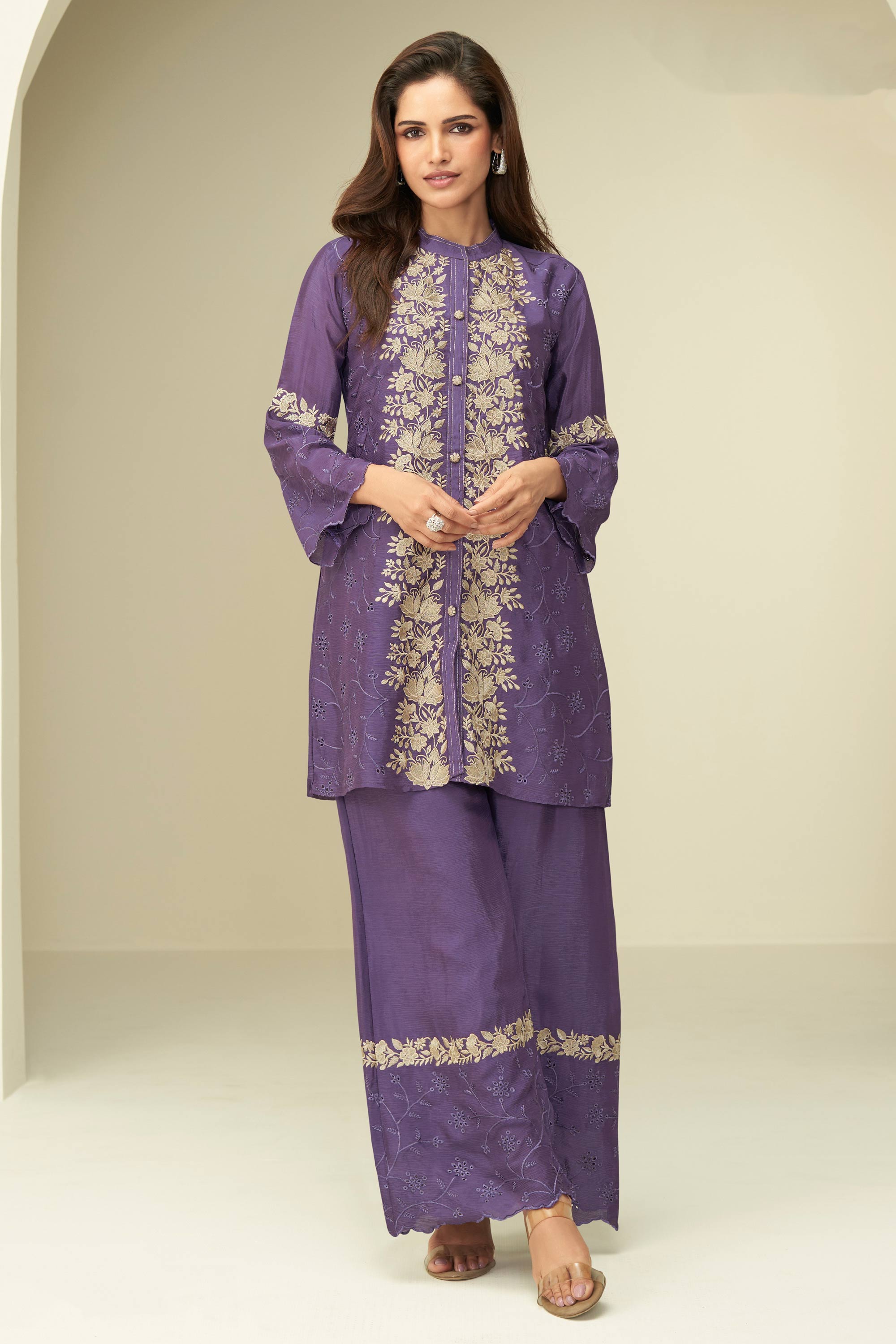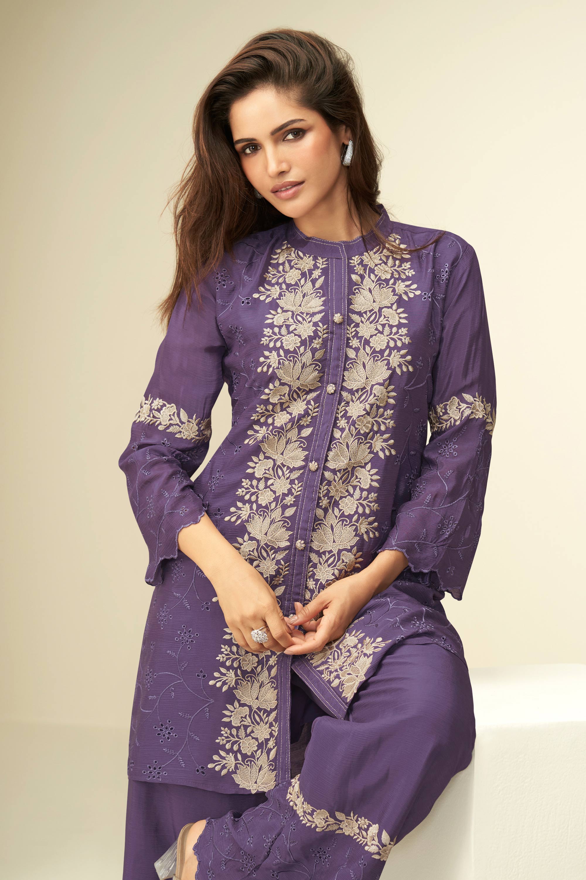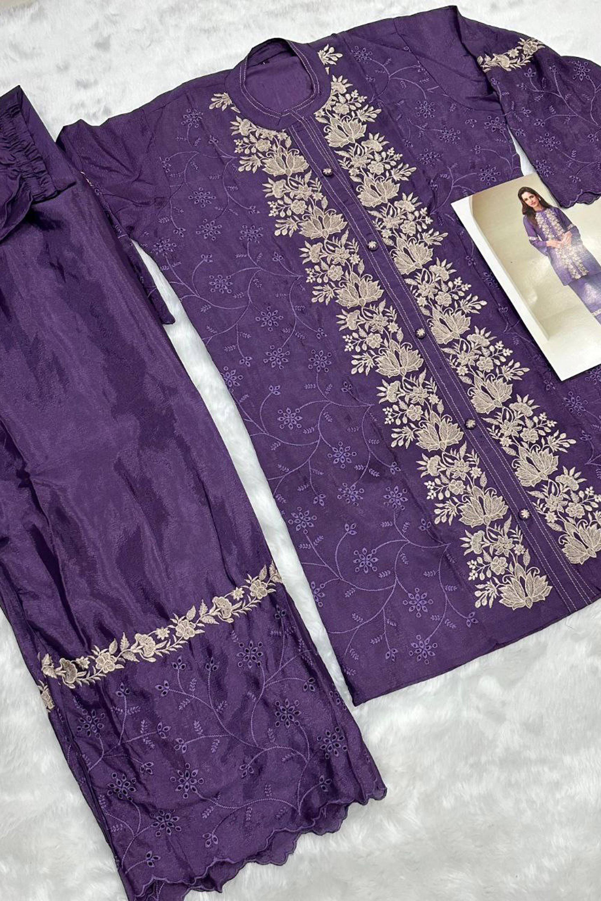 Chinon Silk Purple Embroidered Designer Readymade Co-Ord Set