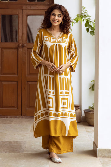 Exclusive Mustard Yellow Abstract Geometric Print Ethnic Set