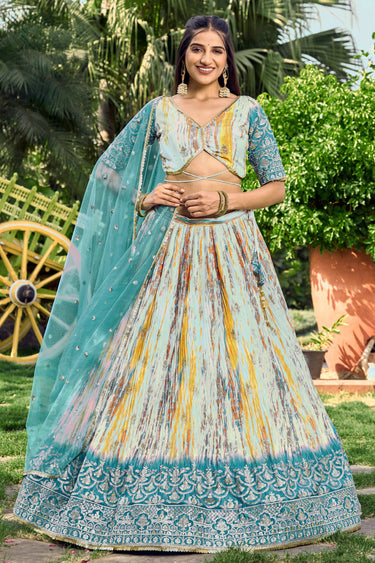 Chinon Fabric Teal Color Elegant Function Look Sequins Designs Lehenga