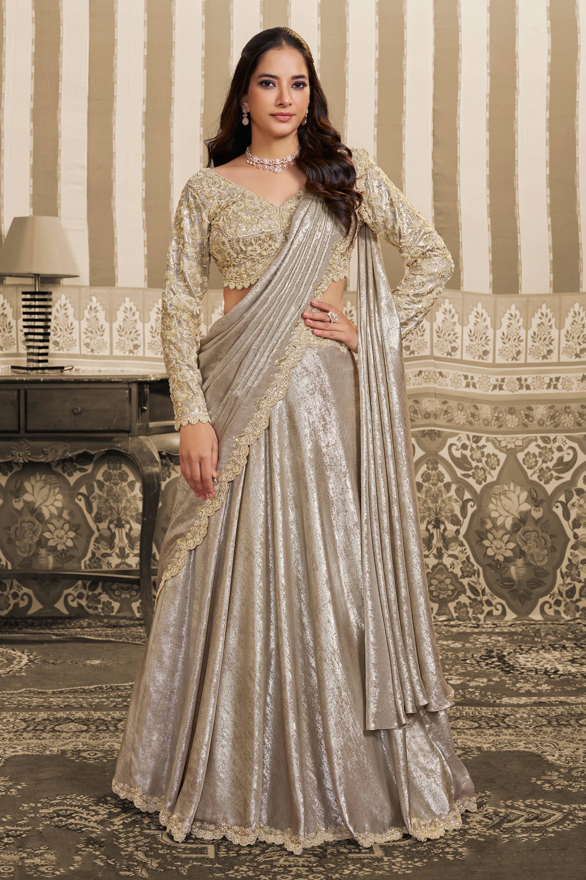 Cream Sequins Work Satin Ready To Wear Lehenga Saree For Wedding Wear