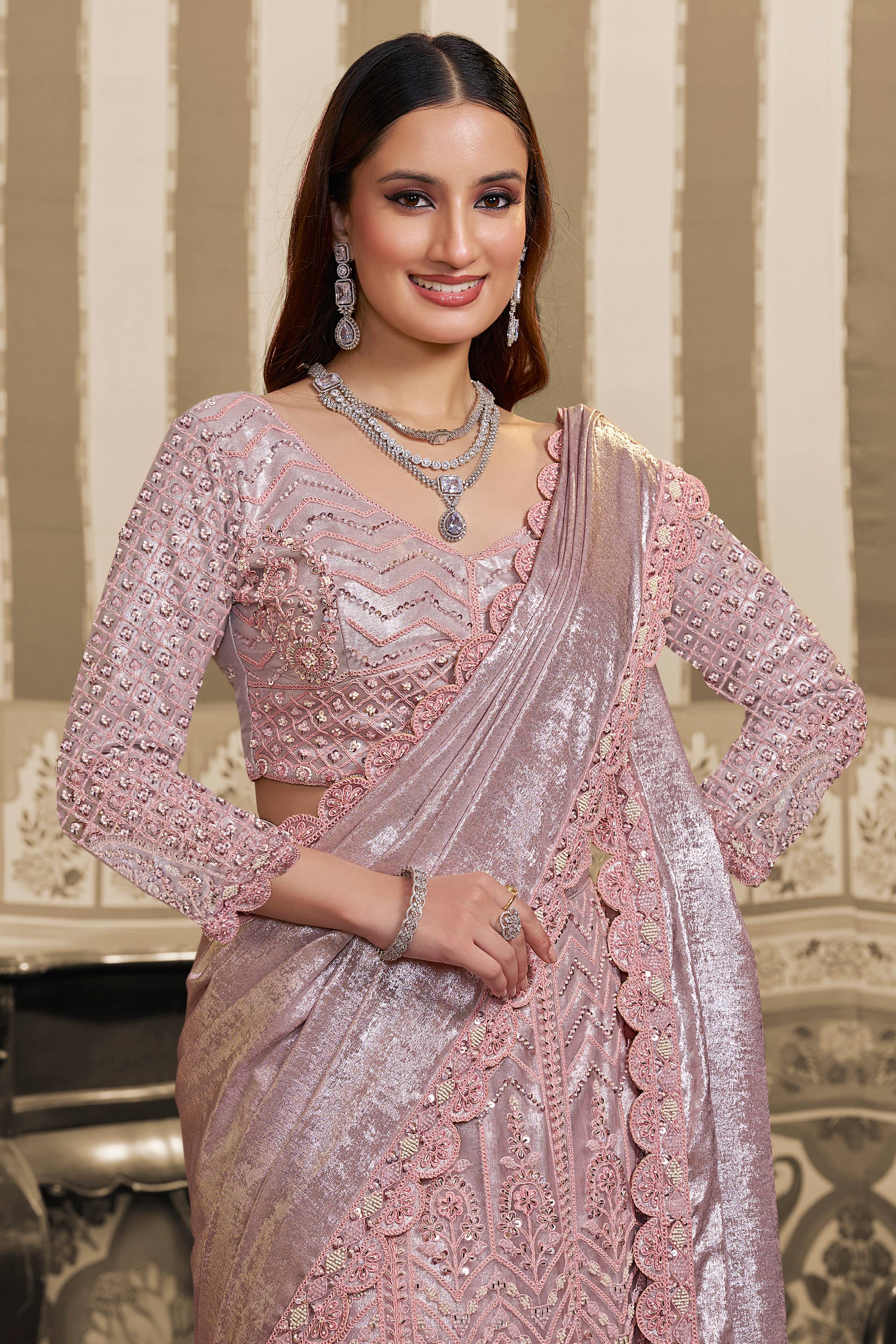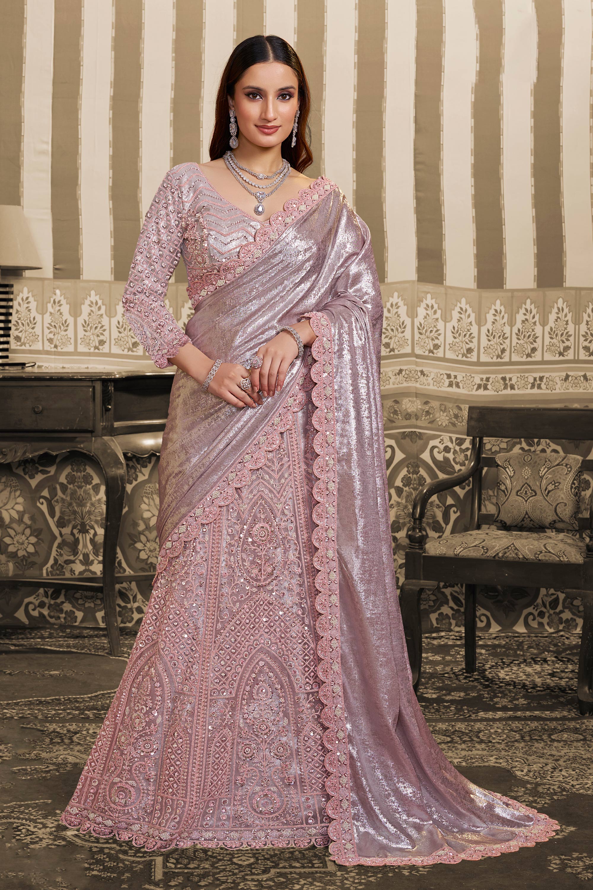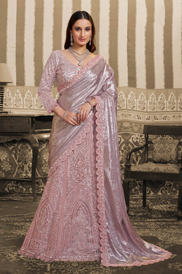 Pink Wedding Wear Satin Sequins Work Ready To Wear Lehenga Saree