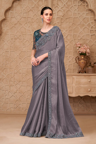 Embroidered Georgette Satin Grey Saree For Festive Wear