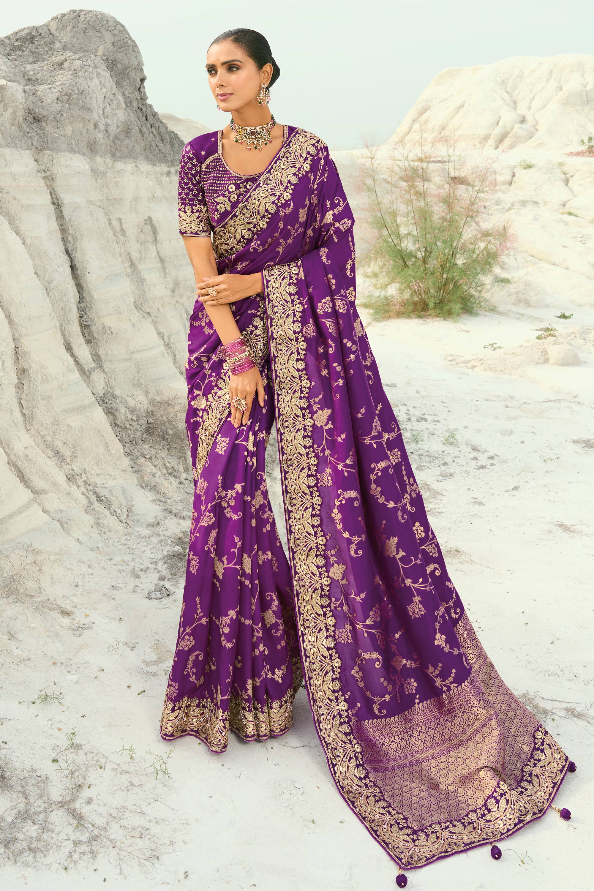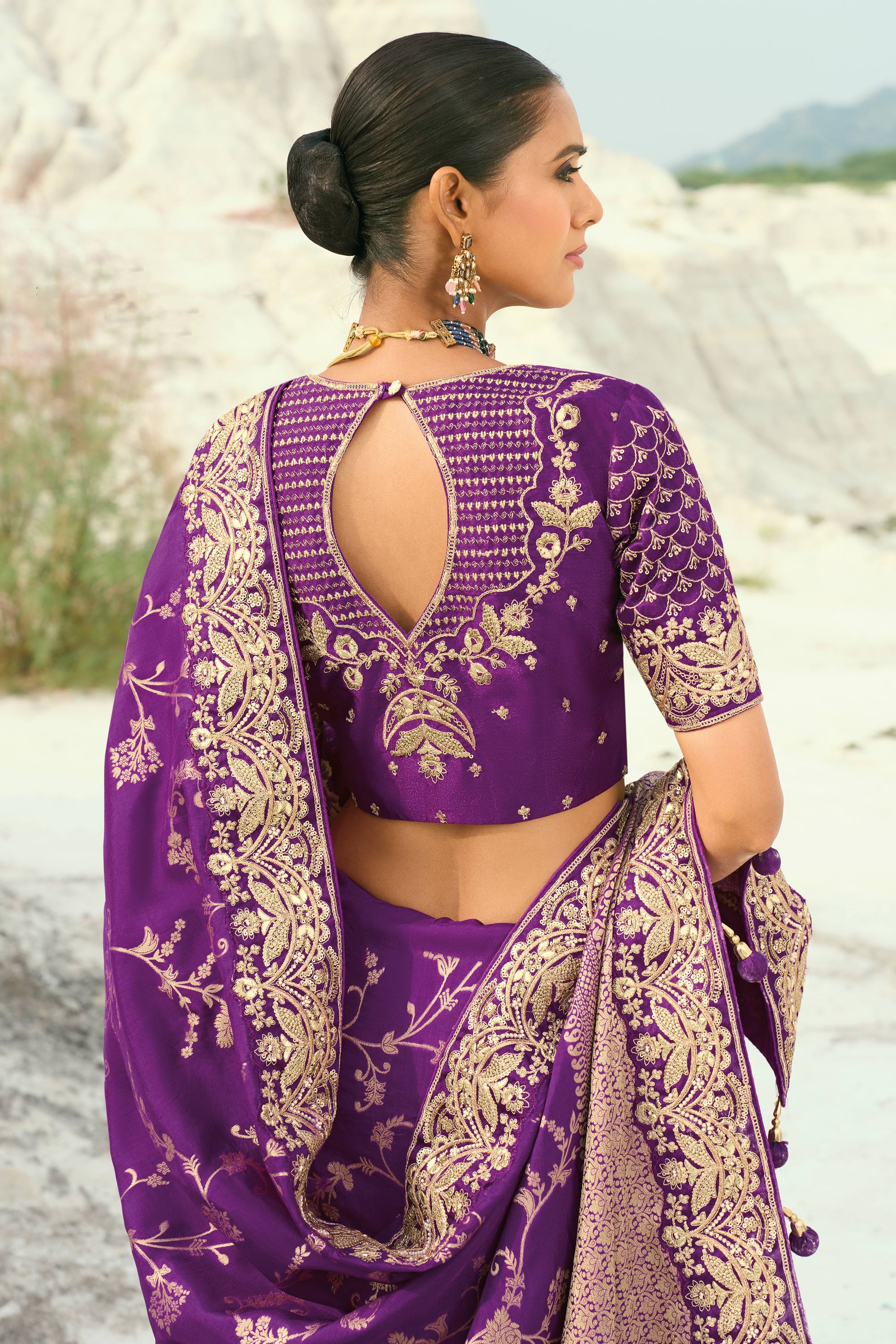 Viscose Border Work Purple Saree With Embroidered Blouse