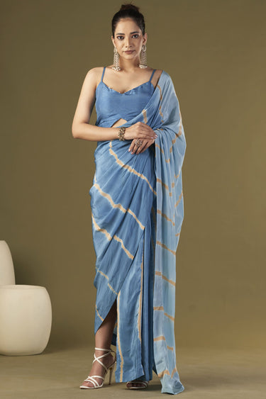 Make a bold statement at any party or event with our exclusive Blue Color Viscose Crepe Fabric Embroidered Work Party Wear Designer Readymade Pre Draped Saree. The beautiful ocean blue tie-dye effect with ombre transition creates an elegant and captivating look. Our saree comes ready-made, so you don't have to fuss about the draping process. Additionally, this stunning piece is paired with a butterfly blouse that features pearl and shell tassels in the back for added style points. Our attention to detail doesn't stop there; the saree's high-quality embroidery work provides exquisite embellishments that add an extra layer of sophistication to this piece. The comfortable viscose crepe fabric is perfect for wearing throughout the day and long into the evening while staying cool and feeling relaxed. Turn heads at your next event with our exclusive readymade saree that combines elegance, comfort, and style in one breathtaking package!