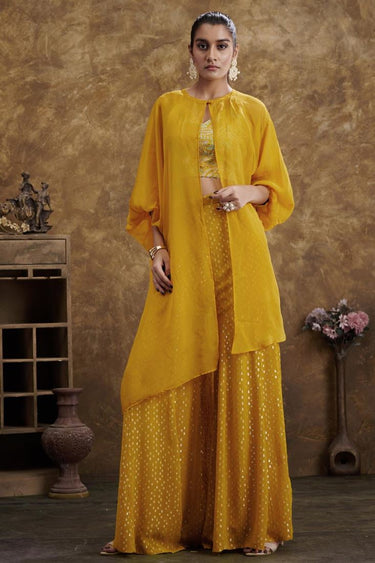 Exclusive Yellow Color Hand Embroidered Party Wear Readymade Sharara Set With Jacket