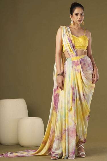 Get ready to stun the crowd with our Exclusive Yellow Color Viscose Crepe Fabric Embroidered Work Party Wear Designer Readymade Pre Draped Saree! The tie and dyed drape saree boasts of a unique blend of hues in ivory, yellow, plum, and teal that are sure to turn heads wherever you go. This pre-draped saree is perfect for those who don't have the time or energy to spend hours draping it around their waist. Instead, slip it on in just minutes and make an effortless yet elegant statement. To complete this stunning ensemble, we've paired it with a beautiful yellow bustier featuring hand embroidery with pearls and cowries. Made from high-quality viscose crepe fabric, this outfit not only looks fantastic but also feels comfortable on your skin all day long. So get ready to make a fashion statement at your next party with our designer saree!