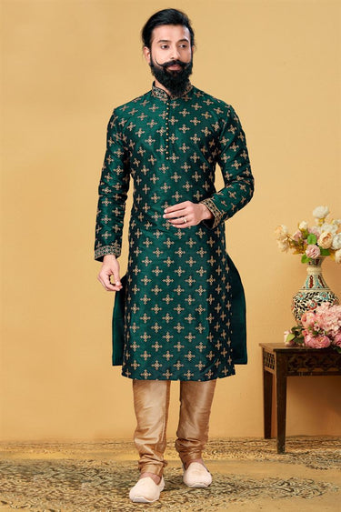 Teal Color Art Silk Fabric Sangeet Wear Embroidered Readymade Kurta Pyjama For Men