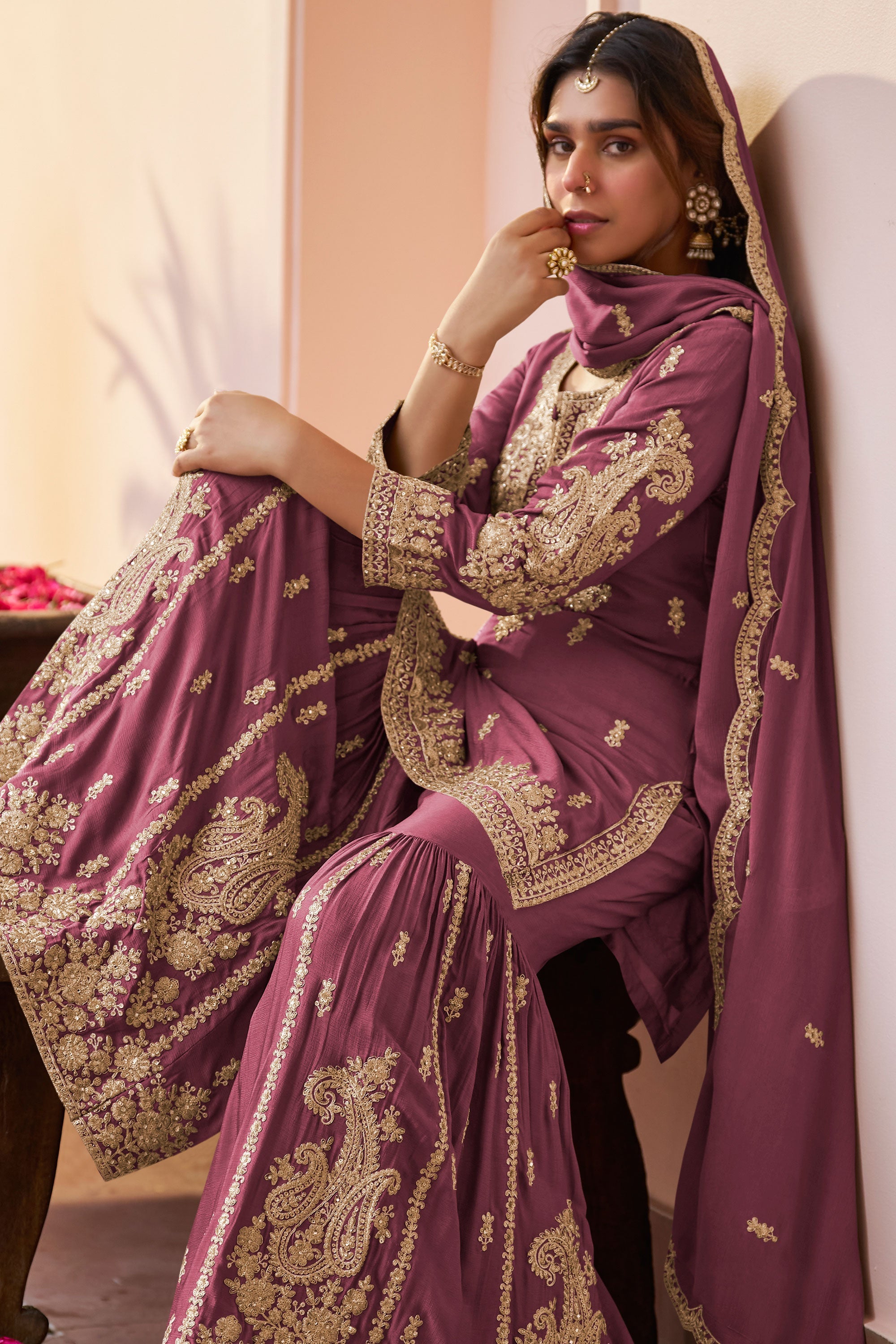 Attractive Pink Chinon Embroidered Sharara Style Palazzo Suit