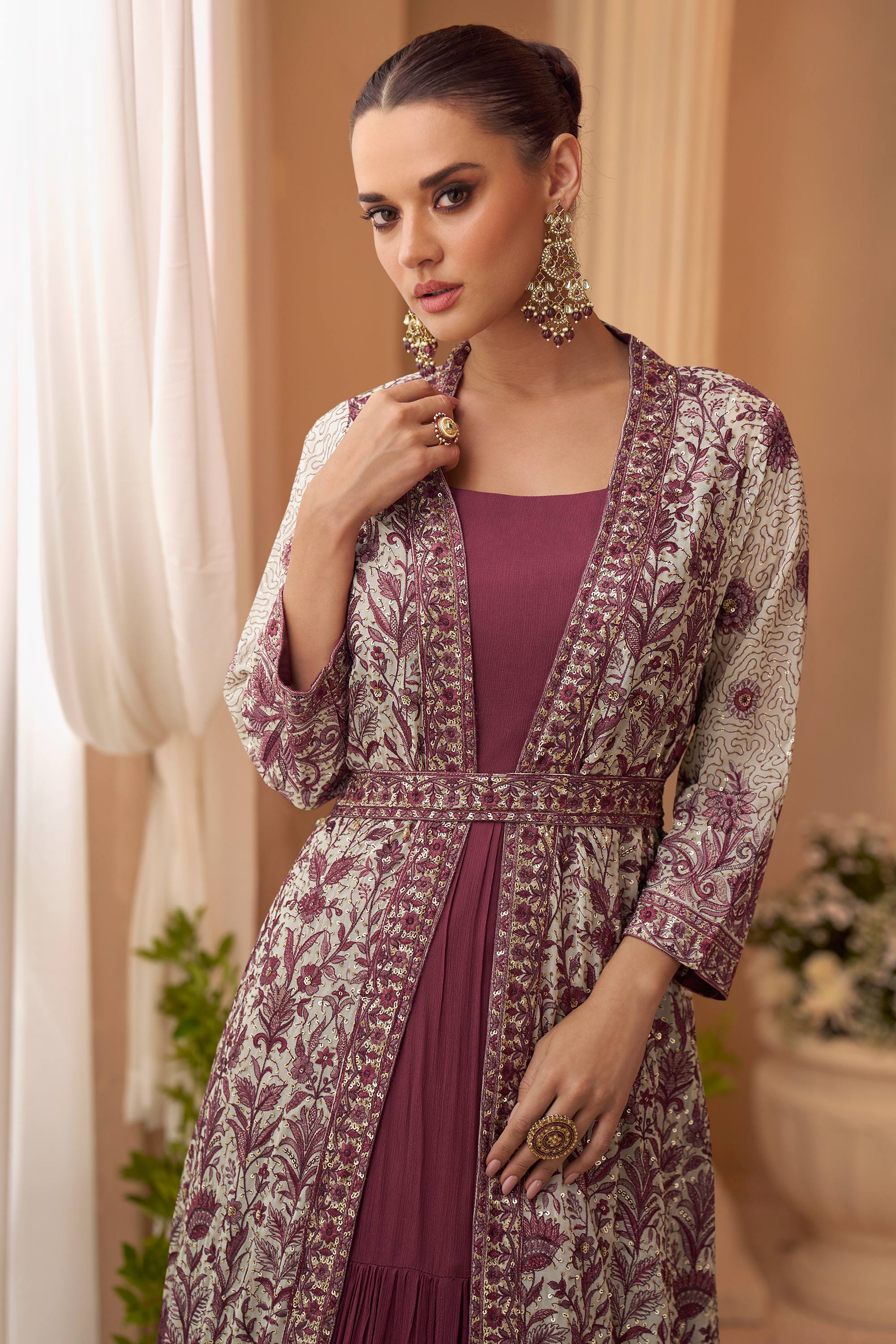 Embroidered Chinon Wine Floor Touch Gown With Long Jacket