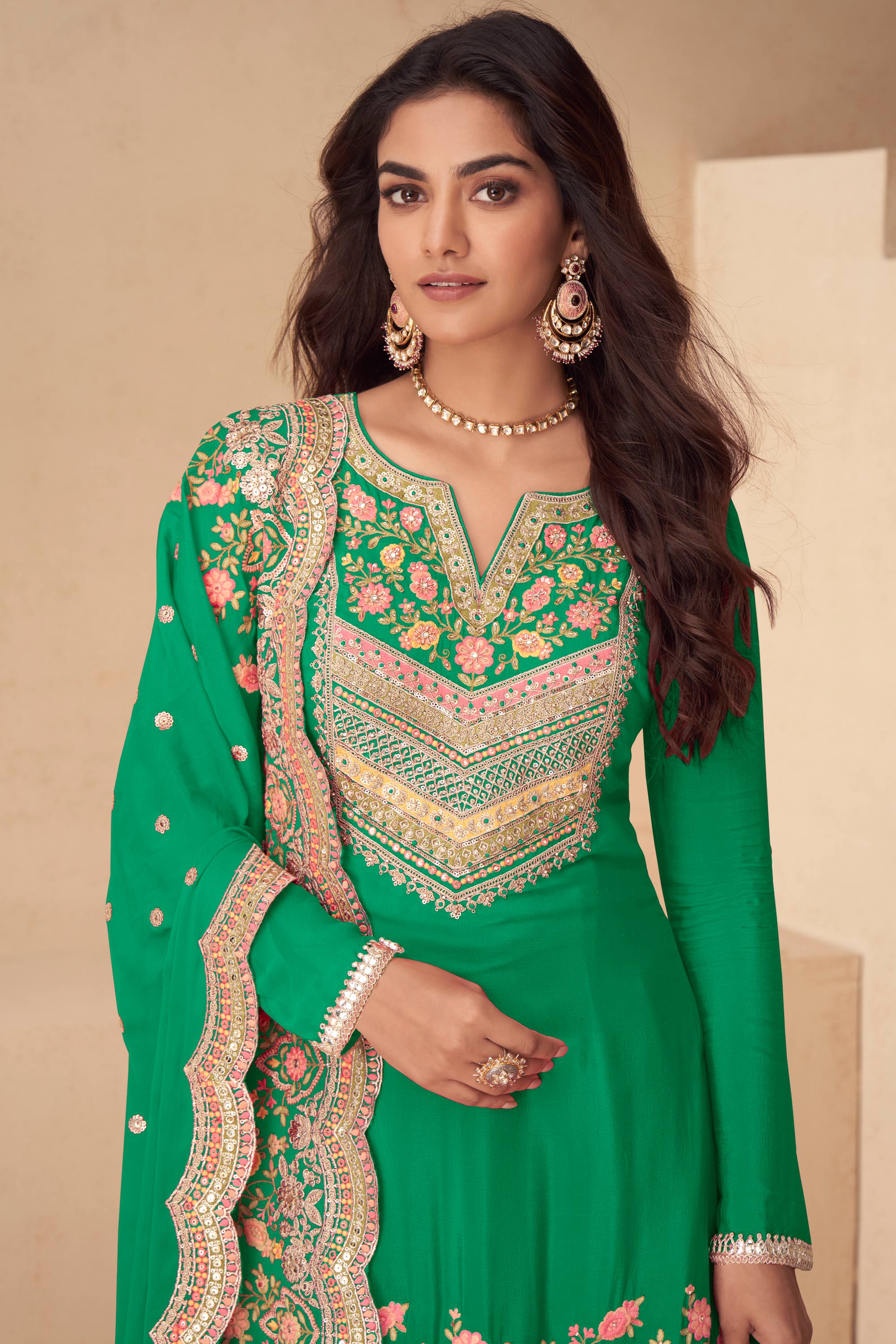 Green Embroidery Work Readymade Palazzo Salwar Kameez