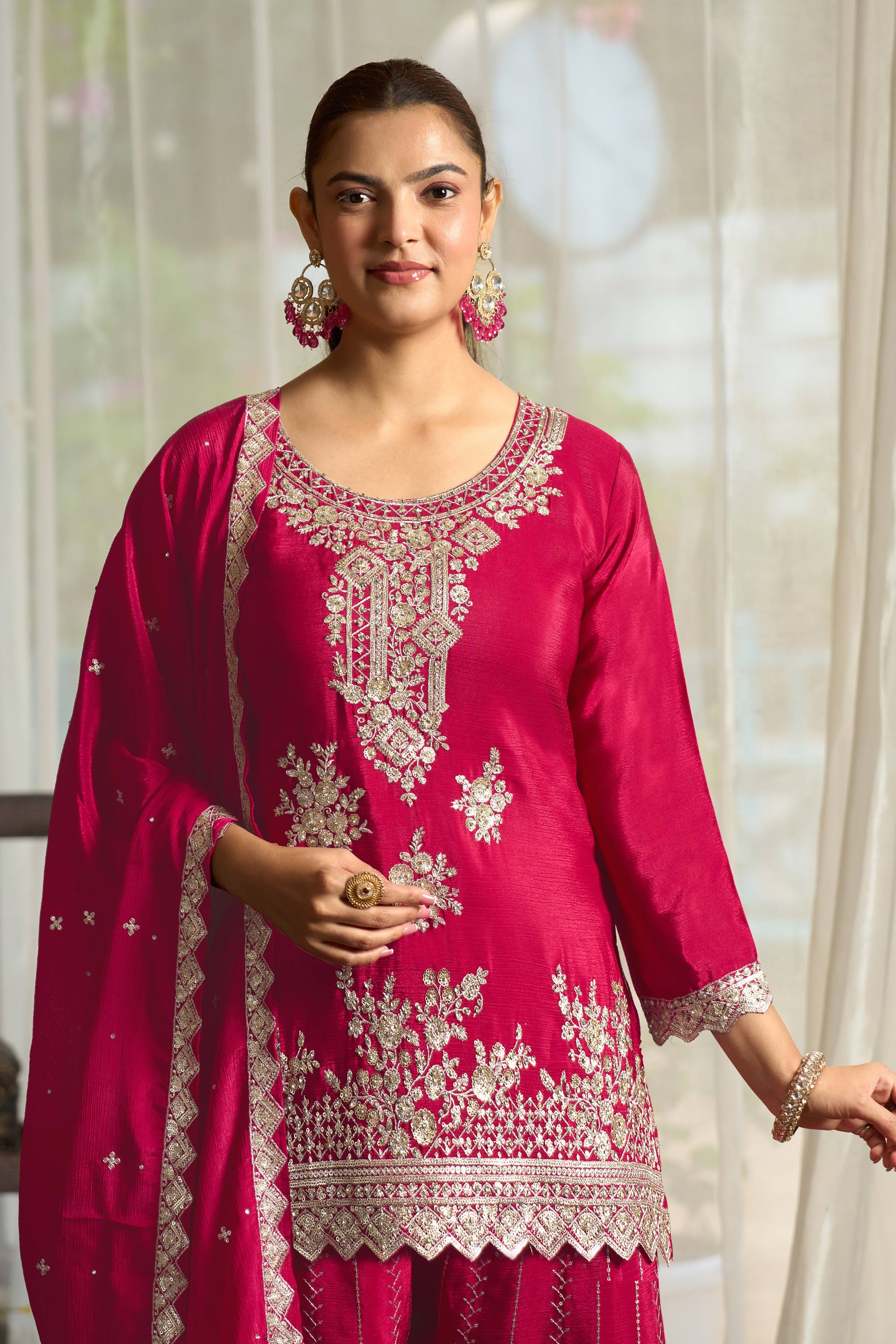 Enhance your wardrobe with the elegant Chinon Silk Embroidered Designer Readymade Palazzo Salwar Kameez. This stunning outfit combines luxurious chinon silk fabric with intricate embroidery to create a timeless and graceful look for special occasions. Designed for both comfort and style, the readymade palazzo set ensures an effortless fit and allows you to step out with confidence. Ideal for festive events, weddings, or family gatherings, this traditional yet contemporary ensemble offers a touch of sophistication that suits a variety of personal styles.