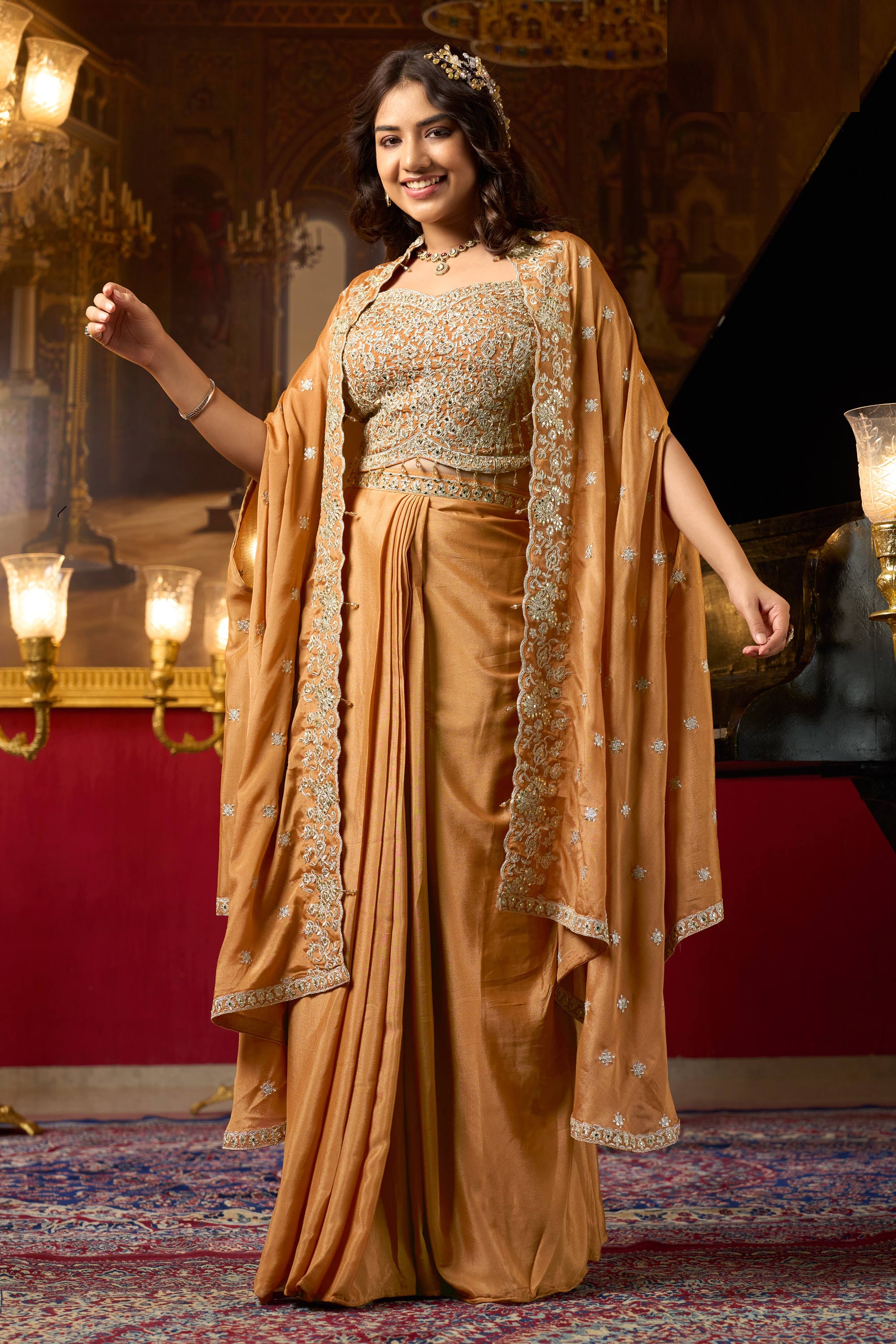 Rust Readymade Palazzo Set With Heavy Blouse And Shrug