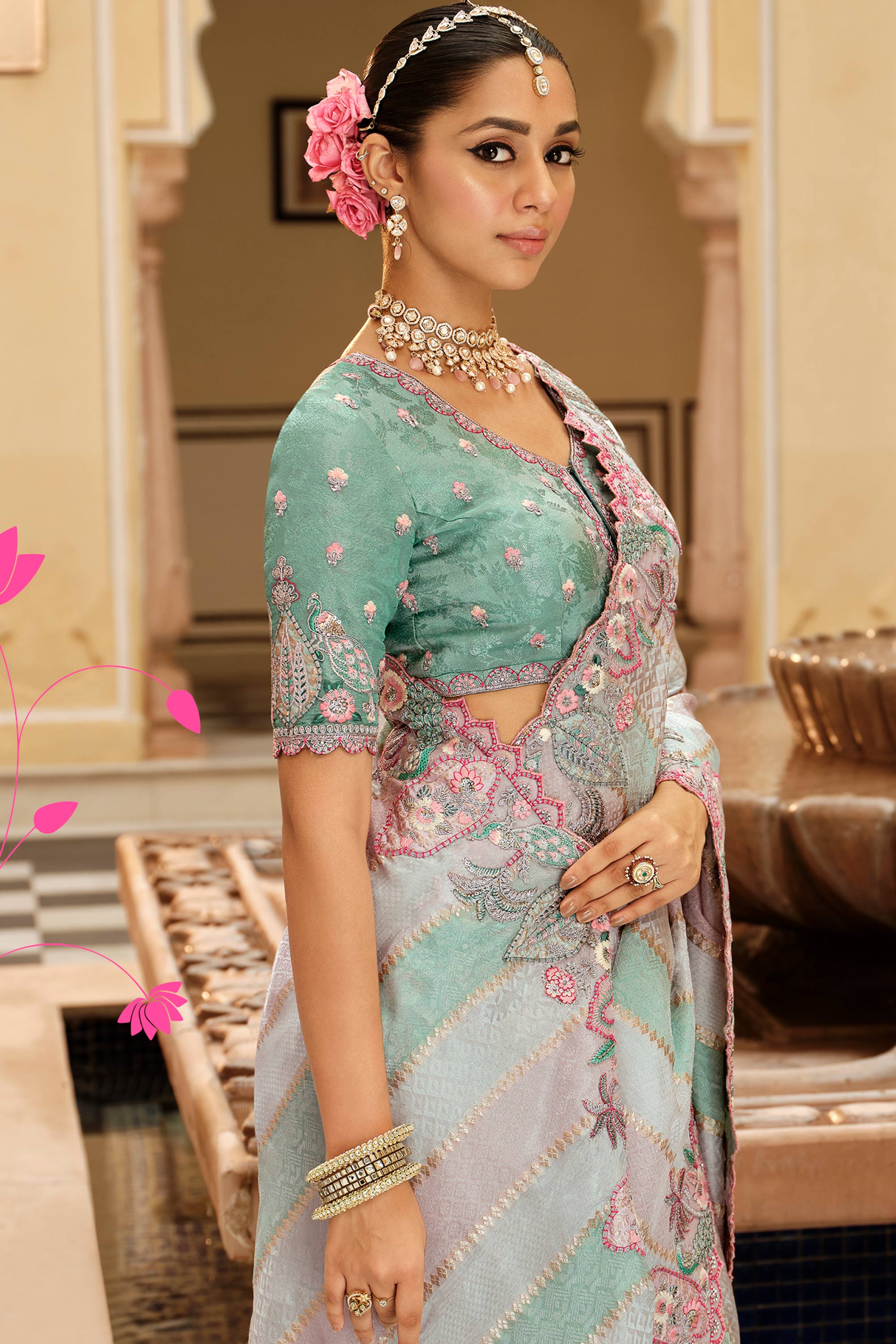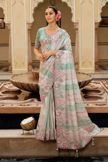 Discover the epitome of traditional elegance with our Function Wear Viscose Jacquard Embroidered Border Work Saree. Crafted with pure viscose jacquard fabric, this saree is adorned with intricate embroidery, shimmering stonework, delicate sequins, and pearls, all enhanced by stunning zari weaving. Perfectly designed for special occasions, its heavy tussle on the pallu adds an opulent touch to your ensemble. Ideal for weddings, festive celebrations, and party essentials, this saree seamlessly blends sophistication with timeless beauty. Step into any event exuding grace and charm.