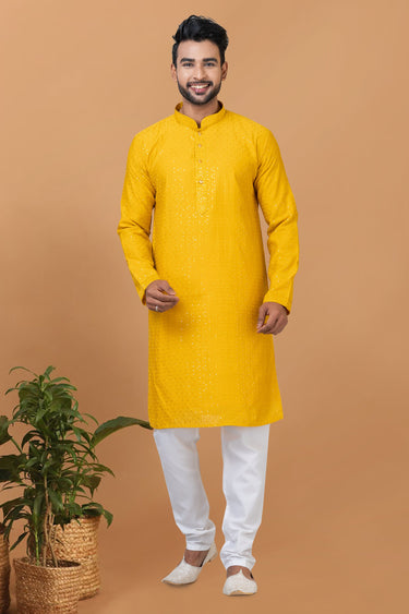 Cotton Sequins Embroidery Mustard Magnificent Readymade Men Kurta Pyjama For Sangeet Wear