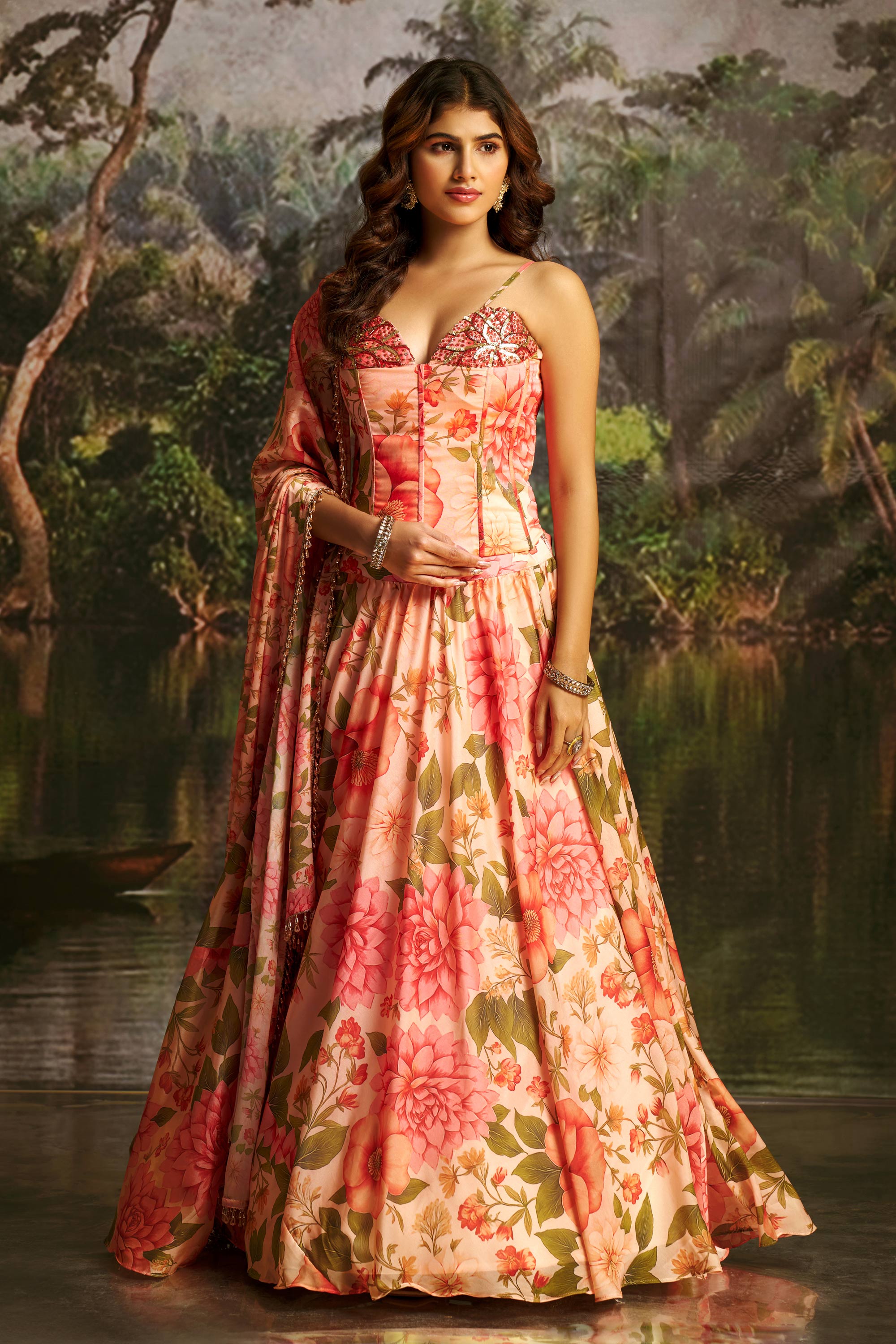 Floral Printed Georgette Peach Readymade Lehenga Set With Corset Blouse For Festive Wear