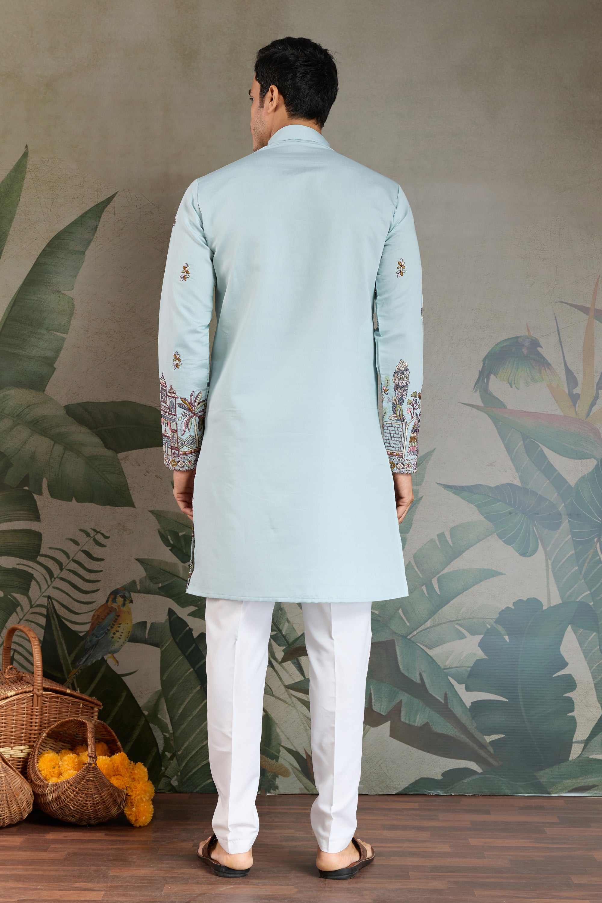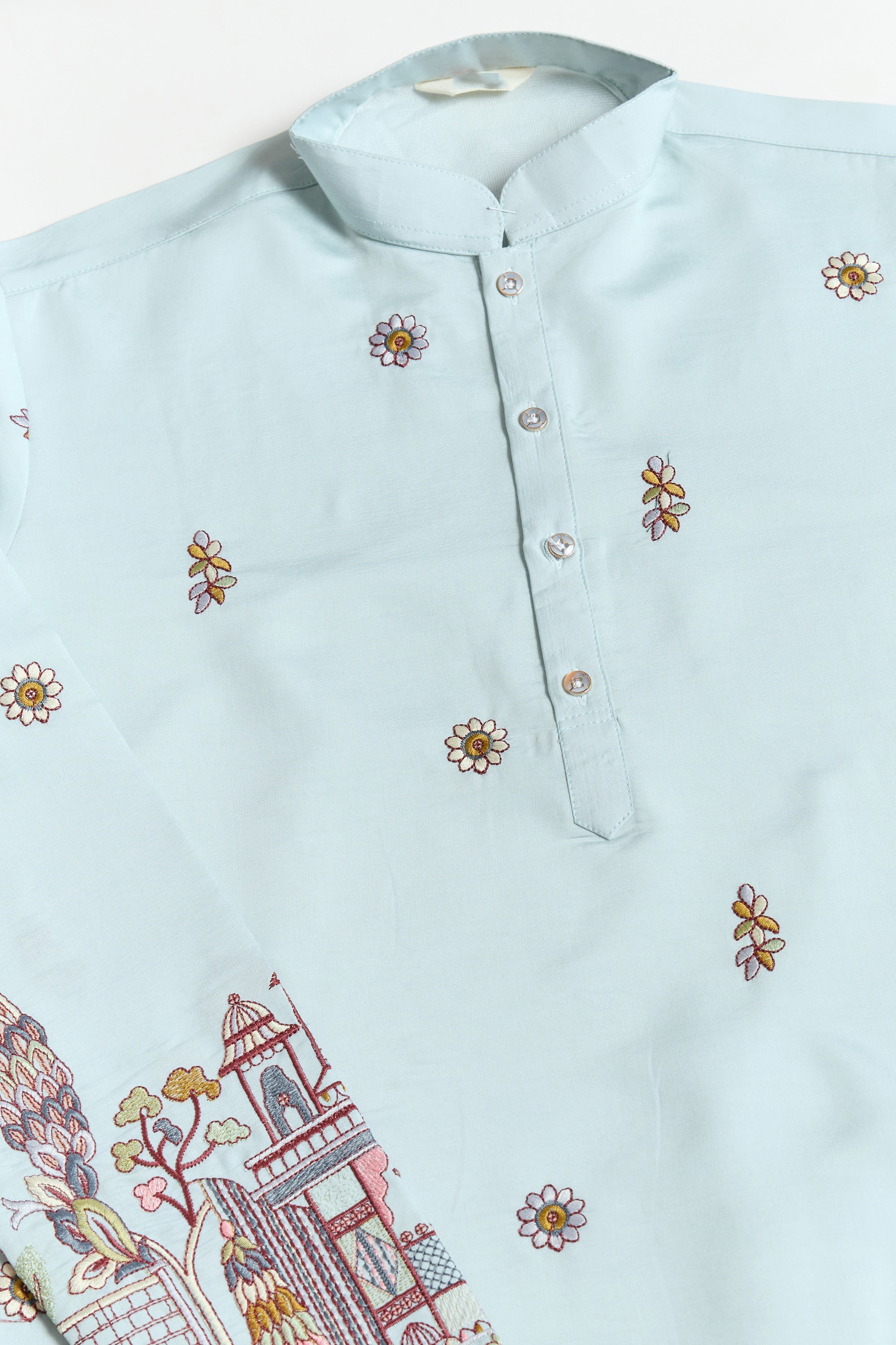 Sequins Embroidery Sky Blue Viscose Silk Graceful Readymade Men Kurta With Dupatta