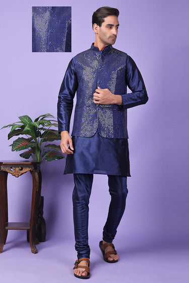 Art Silk Fabric Navy Blue Color Festive Wear Readymade Men Stylish Kurta Pyjama With Embroidered Jacket set