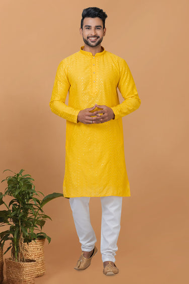 Sequins Embroidery Pretty Cotton Fabric Sangeet Wear Readymade Men Kurta Pyjama In Yellow Color