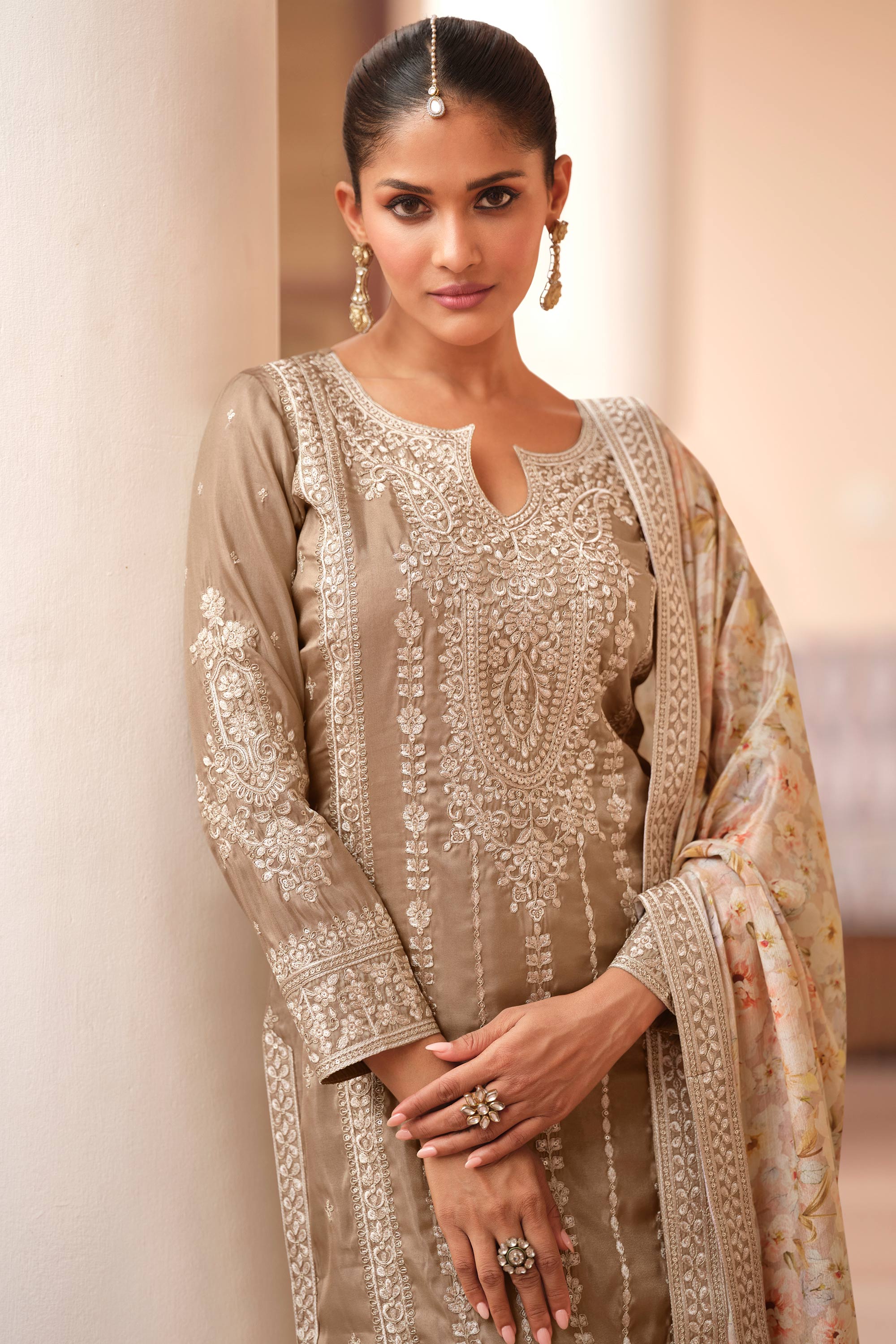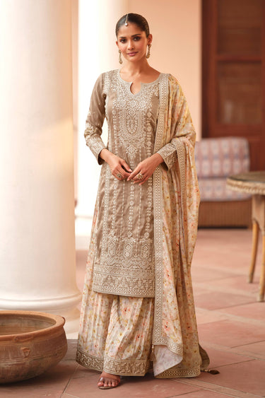 Beige Art Silk Embroidered Sharara Style Palazzo Salwar Kameez